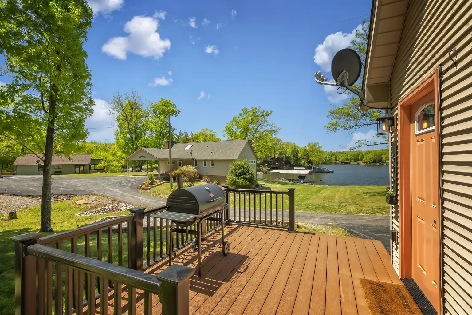 • Lake views from living room, kitchen, dining room, the deck, patio, and private dock.