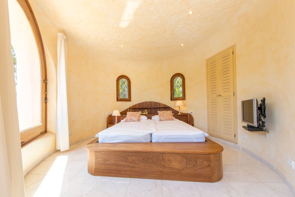 The distinctive architecture of the house is a pleasant surprise. Spacious rooms such as the large dome and the loft like extension, where the open kitchen, dining room and chill out space join onto each other. Wall paintings by local artists give each room a unique feel. Casa Redonda harmoniously combines Arabic architecture with the domes and round rooms with the Ibizan building style, natural stones and juniper wood.