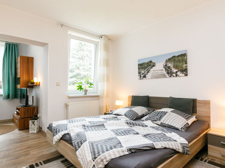 2-family house. On the outskirts, 500 m from the centre of Zinnowitz, 700 m from the sea, 700 m from the beach. In the house: central heating system. Parking on the premises. Supermarket 450 m, restaurant, bakery, café 600 m, bus stop, railway station 800 m, sandy beach 700 m, thermal baths "Bernsteintherme" 1.3 km. Marina 1.6 km, golf course (18 hole) 25 km, surf school 1.4 km, tennis 350 m, minigolf 1.3 km."Tauber", 2-room apartment 38 m2, on the ground floor. Beautiful furnishings: small living room with cable TV (flat screen). 1 room with 1 double bed. Kitchen (2 ceramic glass hob hotplates, toaster, kettle, electric coffee machine) with dining table. Shower/WC. Terrace. Terrace furniture. Facilities: Internet (WiFi). Parking (1 car) at the house. Please note: non-smokers only. Smoke alarm.
