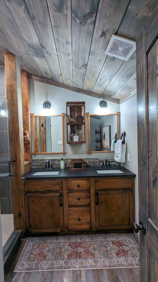 The ensuite master bathroom features a custom-built walk-in shower and double sinks. The bathroom is stocked with soak salts, extra towels, makeup remover, hair dryer. Q-Tips, cotton balls, hand soap, body wash, and shampoo.