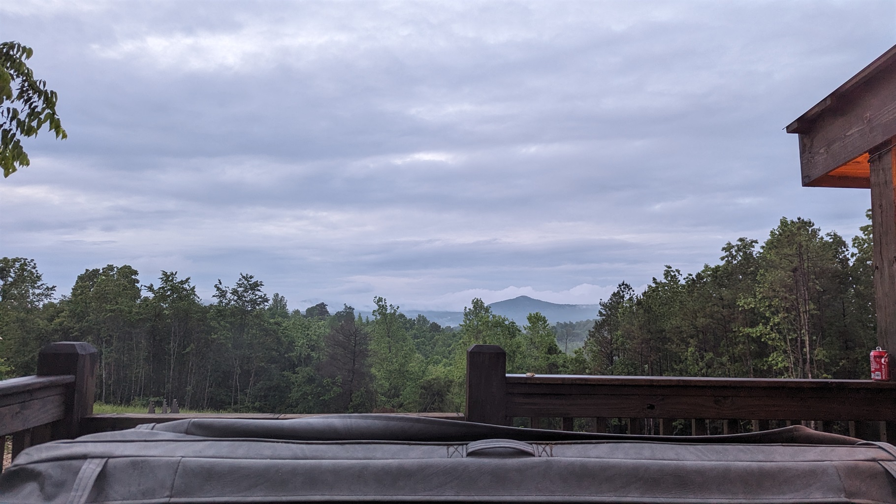 The back deck features fantastic views of the forest and mountains, an 8-person hot tub, an ice chest, built-in fans, and seating for the entire family.