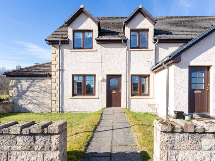 Cosy, comfortable apartment house "The Bruach". 2 km from the centre of Aviemore, in a quiet, sunny position, 15 km from the lake, 18 km from the skiing area, in a cul-de-sac. In the complex: storage room for bicycles, storage room for skis. Parking at the house, public parking. Shop 100 m, grocery, supermarket 1 km, restaurant 1 km, bar 1 km, bus stop "Aviemore (burnside rd)" 450 m, railway station "Aviemore" 2 km. Golf course (18 hole) 1 km, ski lift 18 km. Nearby attractions: Dalfaber Golf & Country Club 1 km, Cairngorm National Park, Highland Wildlife Park 15 km, Inverness 48 km, Landmark Forest Adventure Park 9 km, Highland Folk Museum 27 km. Well-known ski regions can easily be reached: Cairngorms ski resort 18 km, The Lecht ski resort 54 km. Well-known lakes can easily be reached: Loch Morlich 15 km, Loch Garten 14 km, Loch Ness 69 km. Please note: car recommended.3-room apartment 64 m2. Bright, comfortable and cosy furnishings: living/dining room with dining table and TV (flat screen). 1 double bedroom with 1 double bed and shower/WC. 1 double bedroom with 2 beds. Kitchen (4 hot plates, oven, dishwasher, toaster, kettle, microwave, freezer, electric coffee machine). Bath/shower/WC. Electric heating. Facilities: washing machine, dryer, children's high chair, baby cot for up to 2 year olds. Internet (WiFi, free). Please note: non-smoking house. Maximum 1 pet/ dog allowed. TV only EN. Smoke alarm. Dogs only, no cats. HI-70141-F