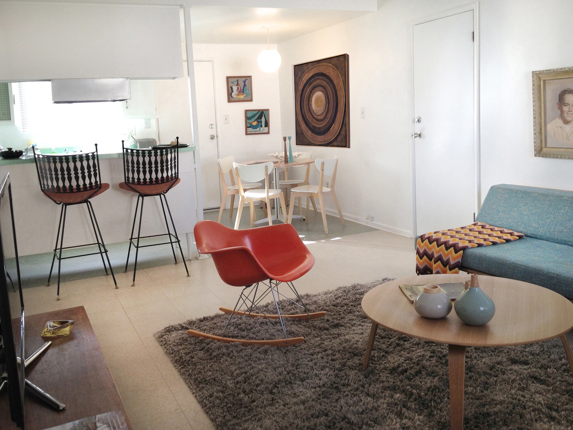 Large Mid-Century Studio apartment (aprx 500 sq ft) in quiet building located in the Spa Zone of Desert Hot Springs, CA. 1 Bedroom (queen size bed), 1 bath, living room, dining area , full kitchen, and free off-street parking.