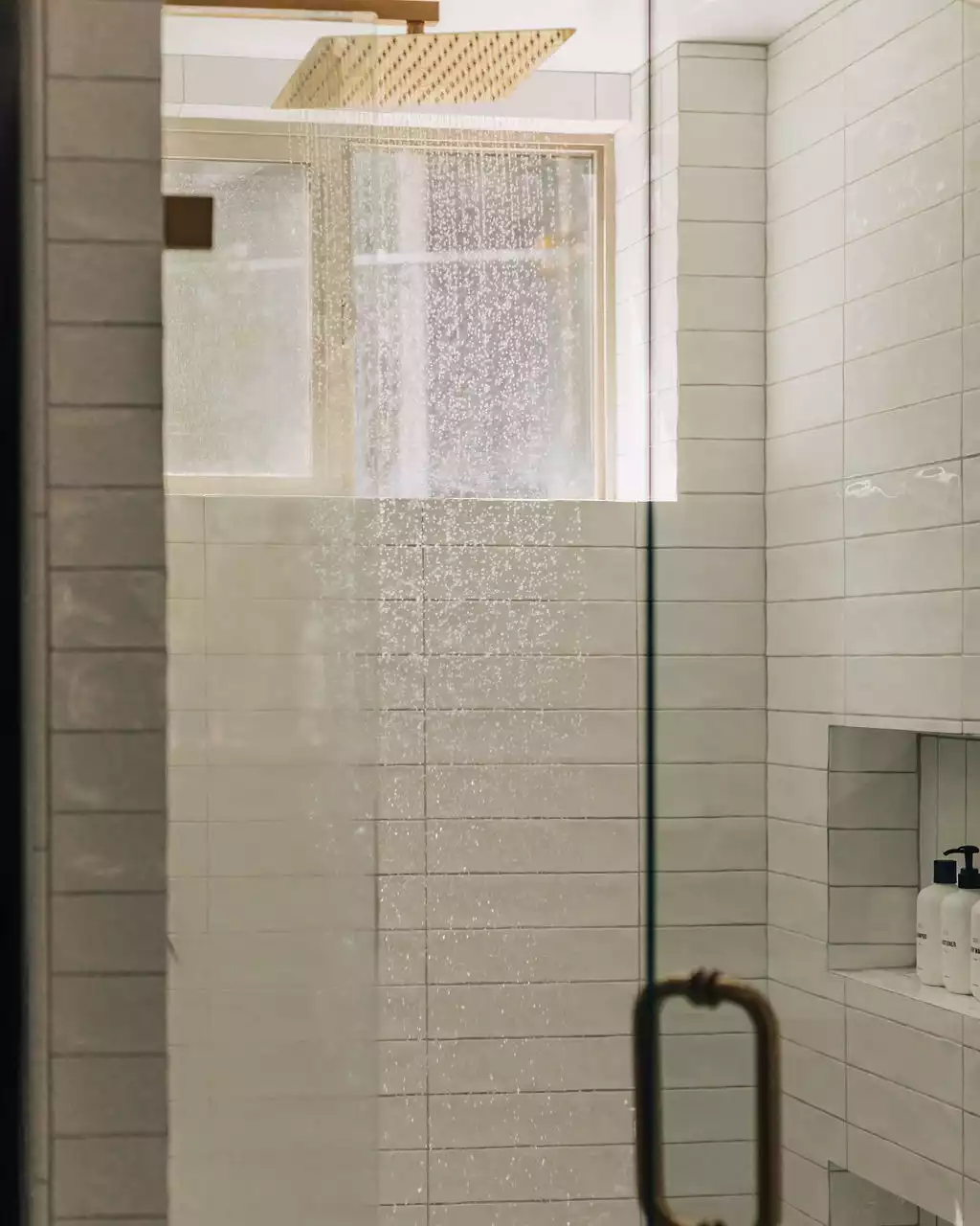 This fully remodeled bathroom features sleek black tile flooring, a soaking tub, white oak floating vanity, and brand new bright white shower tile laid "on trend" in a beautiful herringbone pattern. Although it does feature a modern matte black 10" shower-head, this bathroom is better suited for soaking in the tub and escaping away into your current novel; for those looking for the ultimate shower experience, we recommend using the downstairs shower instead.
