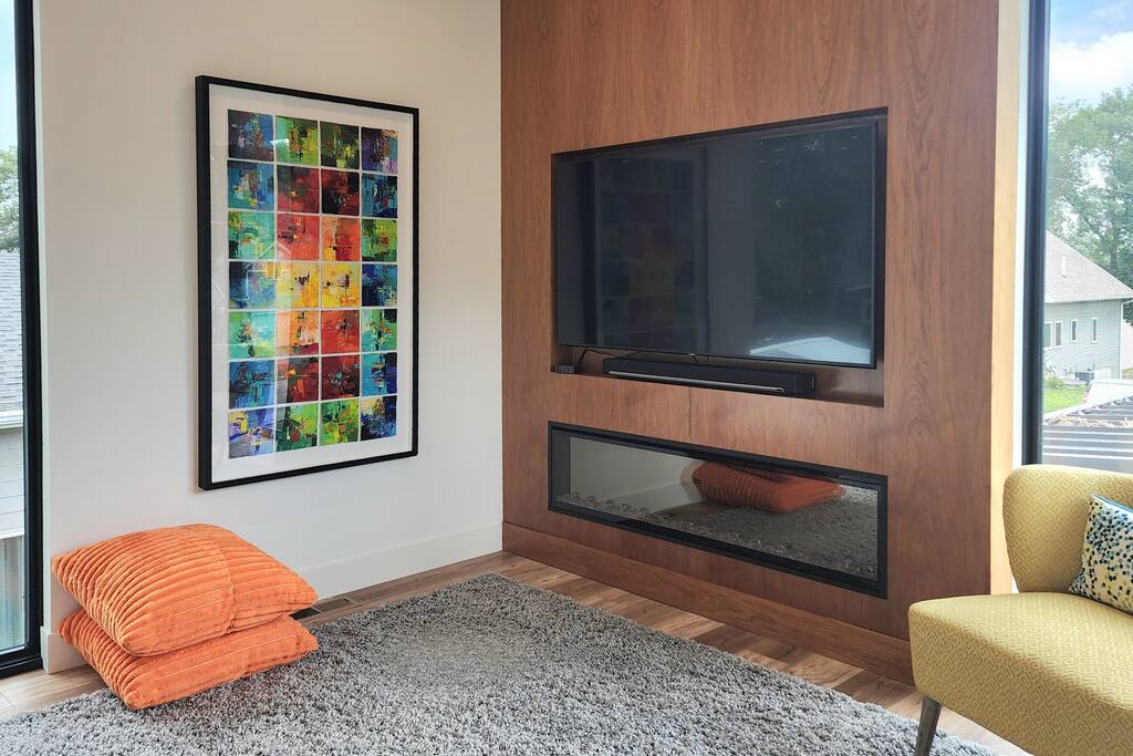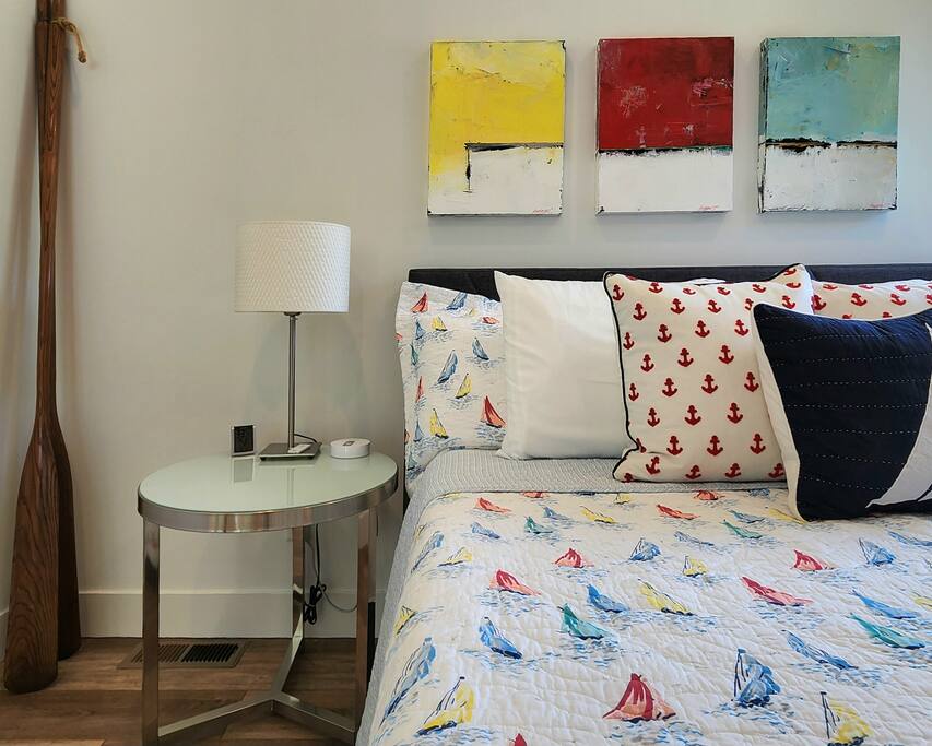 The living room has a HUGE sectional for kicking back and relaxing in comfort while gazing at the lake views. You will find a Sonos sound system ready to be linked to your phone to stream the music you enjoy. The living room also has a smart TV - so remember to bring your Netflix/Amazon Prime/streaming credentials with you on your trip. A separate little seating area allows for private conversation for two. We haven't forgotten the kids with our floor pillows and plush rug - perfect for movie night! There is more than enough room for everyone to settle in at "The OverlOOk."