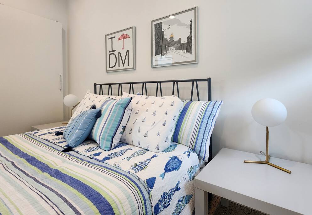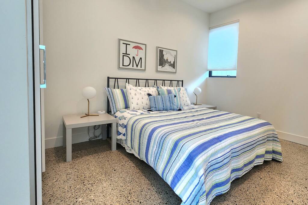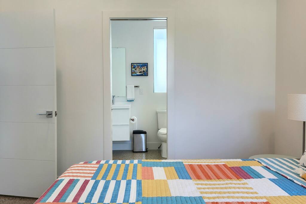 There is a queen-sized bed in the large, 2nd floor main suite, with cozy bedding and plenty of space. The main bedroom suite has an adjoining bathroom with a walk-in shower and double vanity. The main suite is the only bedroom on the second floor of the house (which is where the kitchen, dining, and living spaces are).