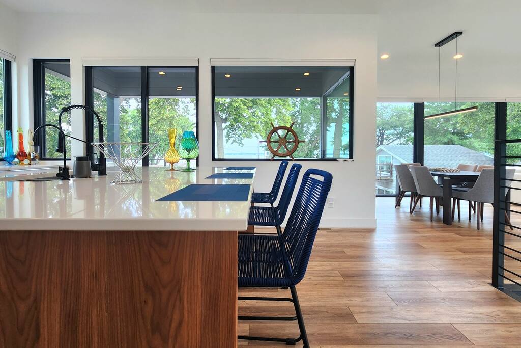 Heading out of the living room, you come to the dining space with formal seating for 6 with lake views. The space is sleek and clean!