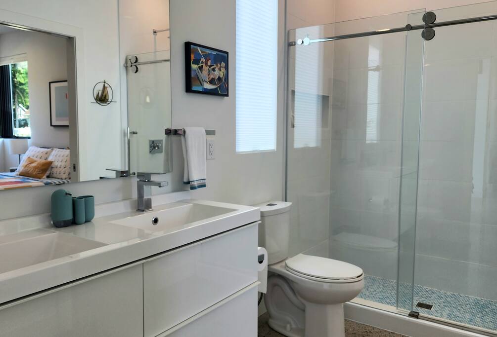 A queen bed is in the entry-level guest bedroom suite with a full bathroom attached with a gorgeous walk-in shower and double vanity.