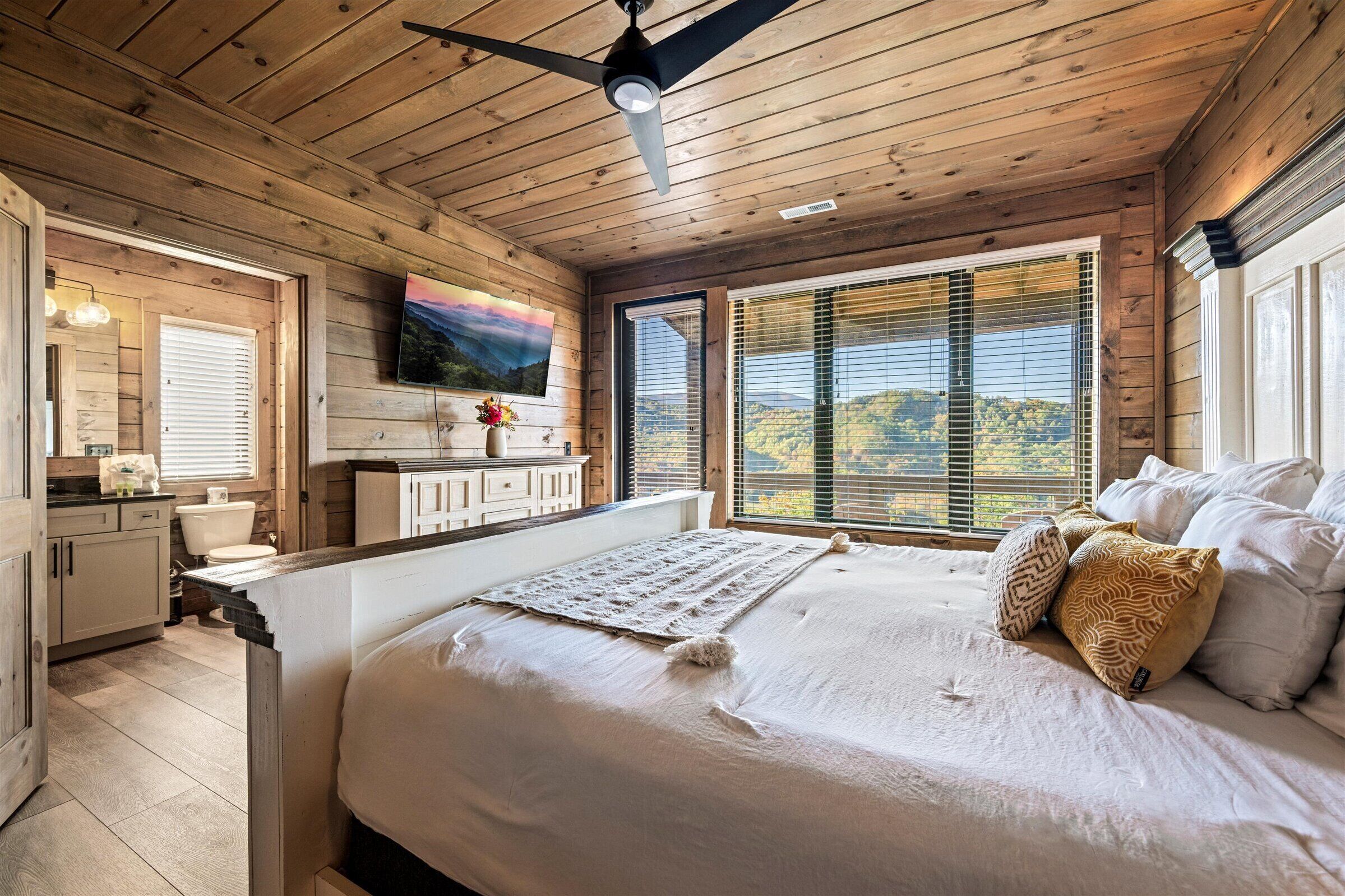 Escape to Thunder Mountain Sanctuary, a luxury 5-bedroom, 5.5-bath cabin in Pigeon Forge, Tennessee, where panoramic mountain views meet high-end comfort. Perfect for families, groups, and reunions, this modern mountain retreat sleeps up to 12 guests and features a private indoor pool, home theater, arcade, hot tub, and dual fire pits—all surrounded by the breathtaking Smoky Mountains.