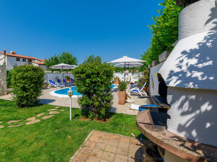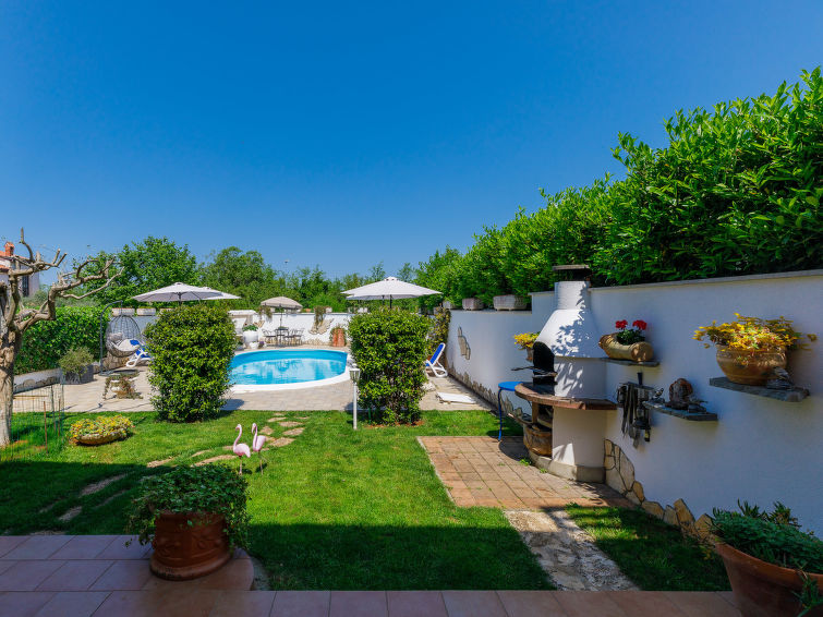 Beautiful 3-family house "Tiziana". In the district of Finida, 2 km from the centre, 2.5 km from the sea. For shared use: beautiful garden (fenced) with lawn and flowers, swimming pool (8 x 4 m, depth 140 cm, seasonal availability: 15.Apr. - 30.Sep.). Outdoor shower, barbecue. In the house: internet access. Parking at the house on the premises. Supermarket 1 km, restaurant 50 m, bus stop 1.7 km, pebble beach 4 km, shingle beach 2.5 km, public bathing area 2.5 km. Sports centre 4 km. Please note: Additional accommodations can be booked.3-room apartment 54 m2, on the upper ground floor. Living/dining room with satellite TV. 1 room with 1 double bed (2 x 80 cm, length 200 cm), air conditioning. Exit to the balcony. 1 children's room with 2 beds (80 cm, length 200 cm), air conditioning. Open kitchen (4 hot plates, oven, kettle, microwave, electric coffee machine). Exit to the garden, to the terrace. Bath/bidet/WC. Heating (extra). Terrace 10 m2, roofed. Terrace furniture. View of the swimming pool. Facilities: Internet (WiFi, free). Parking (fenced). Maximum 2 pets/ dogs allowed.
