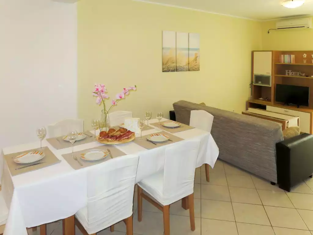 Apartment block "Toni". 350 m from the centre of Grebaštica, 13 km from the centre of Primošten, 15 km from the centre of Šibenik, 350 m from the sea, 350 m from the beach. For shared use: property 500 m2. Barbecue. In the house: internet access. Narrow motor access to the house. Parking on the premises. Shop 350 m, supermarket 9 km, bus stop 650 m, rocky beach 350 m."Toni", 3-room apartment 60 m2 on 1st floor. Living/dining room with 1 sofabed, satellite TV and air conditioning. Exit to the balcony. 1 room with 1 double bed. Exit to the balcony. 1 room with 1 double bed. Open kitchen (2 hot plates, oven, dishwasher, 2 gas rings, toaster, kettle, freezer, electric coffee machine). Shower/WC. No heating option. Balcony 18 m2. Balcony furniture, deck chairs (2). Partial view of the sea. Facilities: washing machine. Internet (WiFi, free).