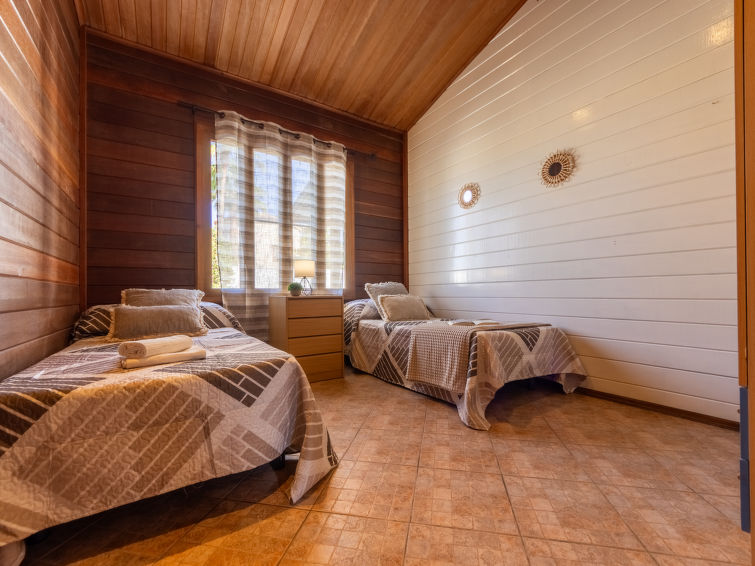 Riumar 10 km from Deltebre: Beautiful, cosy timber house "Tropical 3", semi-detached. In a quiet, sunny position, 500 m from the sea, 500 m from the beach. Private: property (fenced), natural garden, swimming pool angular (5 x 3 m, depth 1 - depth 60 cm, seasonal availability: 01.Mar. - 30.Nov.) with internal staircase. Pergola, terrace, garden furniture, barbecue. In the house: WiFi, air conditioning, washing machine. Parking at the house, public parking on the road. Supermarket 500 m, restaurant, bar 300 m, bakery 700 m, bus stop "Riumar" 650 m, railway station "Aldea- Amposta" 25 km, sandy beach "Riumar" 800 m. Sports harbour 1 km. Nearby attractions: Parque natural Delta del Ebro 2 km, Tortosa 35 km, Playa el Trabucador 29 km, Barcelona 190 km, Port Aventura 70 km. Hiking paths: Parque natural Puerto Tortosa Beseit 52 km, GR 92 15 km. Please note: car recommended. Suitable for families. Groups of teenagers on request only. The photo is just an example."Tropical 3", 4-room chalet 82 m2, on the ground floor. Bright, beautiful and cosy furnishings: living/dining room with dining table and digital TV. Exit to the garden, to the terrace, to the swimming pool. 2 double bedrooms, each room with 1 french bed (135 cm, length 190 cm). 1 double bedroom with 2 beds (90 cm, length 190 cm). Open kitchen in the entrance (4 hot plates, oven, toaster, microwave, freezer, electric coffee machine, pizza oven). Exit to the terrace, to the swimming pool. Shower/WC, hip bath/WC. Air-conditioning, forced-air heating. Terrace furniture, barbecue, deck chairs, covered balcony. Facilities: washing machine, iron, mosquito net, hair dryer. Internet (WiFi, free). Parking at the house. Suitable for families. Maximum 2 pets/ dogs allowed. HUTTE-038554 // Reg. Nr.: ESFCTU0000430190001019260000000000000000HUTTE-0000160