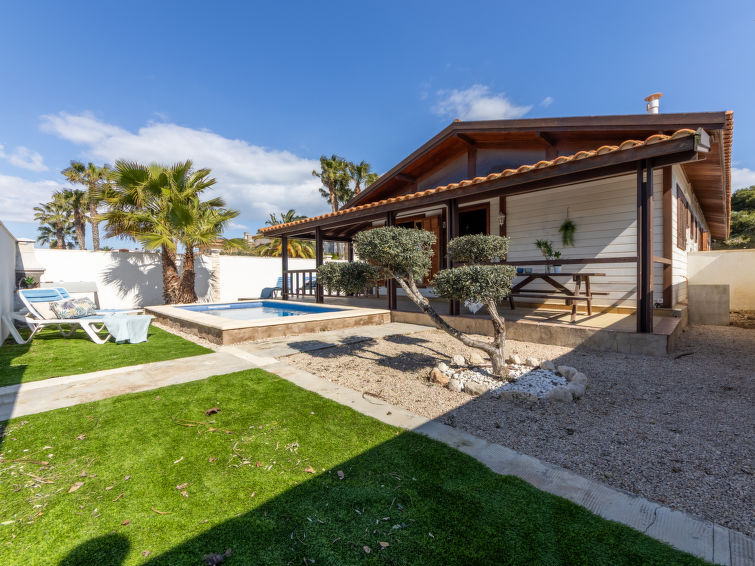 Riumar 10 km from Deltebre: Beautiful, cosy timber house "Tropical 4". In a quiet, sunny position, 500 m from the sea, 500 m from the beach. Private: property (fenced), natural garden, swimming pool angular (5 x 3 m, depth 1 - depth 60 cm, seasonal availability: 01.Mar. - 30.Nov.) with internal staircase. Pergola, terrace, garden furniture, barbecue. In the house: WiFi, air conditioning. Parking at the house, public parking on the road. Supermarket 700 m, restaurant, bar 300 m, bakery 850 m, bus stop "Riumar" 650 m, railway station "Aldea- Amposta" 25 km, sandy beach "Riumar" 400 m. Sports harbour 1 km. Nearby attractions: Parque natural Delta del Ebro 2 km, Port Aventura 65 km, Playa el Trabucador 29 km, Barcelona 190 km, Tortosa 35 km. Hiking paths: Parque natural Puerto Tortosa Beseit 52 km, GR 92 15 km. Please note: car recommended. Groups of teenagers on request only. The photo is just an example."Tropical 4", 4-room chalet 82 m2, on the ground floor. Bright, beautiful and cosy furnishings: living/dining room with dining table, digital TV, air conditioning and forced-air heating. Exit to the patio, to the swimming pool. 2 double bedrooms, each room with 1 double bed (1 x 150 cm, length 190 cm). 1 double bedroom with 2 beds (90 cm, length 190 cm). Open kitchen in the entrance (4 hot plates, oven, toaster, microwave, freezer, electric coffee machine, pizza oven). Exit to the patio, to the swimming pool. Shower/WC, hip bath/WC. Air-conditioning, forced-air heating. Terrace furniture, barbecue, deck chairs, covered balcony. Facilities: washing machine, iron, mosquito net, hair dryer. Internet (WiFi, free). Parking at the house. Suitable for families. Maximum 2 pets/ dogs allowed. HUTTE-002284 // Reg. Nr.: ESFCTU0000430190001019260000000000000000HUTTE-0000177