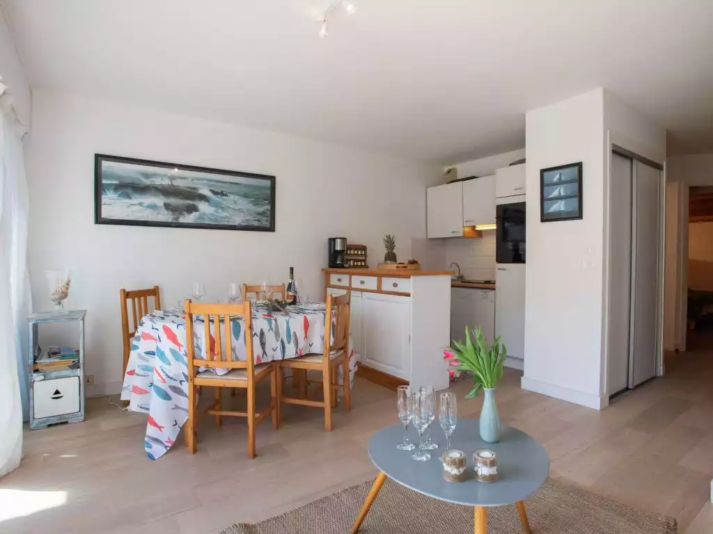 CARNAC PLAGE: Residence "Ty Bihan", 2 storeys. In the resort 1.3 km from the centre of de Carnac Plage, residential area (villas), 50 m from the sea, 50 m from the beach, road to cross. In the complex: storage room for bicycles. Shop 1.3 km, supermarket 1.3 km, 10 minute walk to the centre, bus stop 800 m, sandy beach "Plage de Ty Bihan" 50 m, thermal baths "Thalasothérapie de Carnac" 1 km. Golf course (18 hole) 5 km, surf school 5 km, sailing school 900 m, tennis 2 km, riding stable 5 km. Nearby attractions: La Trinité sur Mer 5 km, Presqu'ile de Quiberon 15 km, Auray 15 km, vannes 30 km, Lorient 30 km, Belle île en Mer, Houat, Hoedic. Hiking paths: Le golfe du Morbihan. Please note: no lift. Suitable for families. Object suitable for 2 adults + 2 children.2-room apartment 40 m2, on the ground floor. Object suitable for 2 adults + 2 children. Comfortable and beautiful furnishings: living/dining room with TV (flat screen). Exit to the terrace. Sleeping alcove with 1 x 2 bunk beds (90 cm, length 190 cm). 1 room with 1 french bed (1 x 140 cm, length 190 cm). Kitchenette (oven, dishwasher, 2 ceramic glass hob hotplates, toaster, kettle, electric coffee machine). Shower, sep. WC. Terrace 20 m2, south facing position. Terrace furniture, deck chairs (2). View of the garden. Facilities: washing machine, iron, hair dryer. Internet (WiFi, extra). Parking at the house. Please note: suitable for families. Non-smokers only. Smoke alarm. Ceiling height of low master bedroom 1.85m. Instead of an enclosed bedroom, some sleeping areas are located in an open-plan area (gallery, alcove, etc.). 5603400066170B