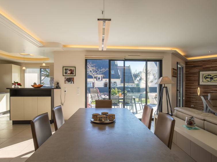 Modern house "Ty Pleine", built in 2016. 800 m from the centre of Le Guilvinec, 5 km from the centre of Penmarch, 13 km from the centre of Pont l'Abbé, in the residential district, 300 m from the sea, from the beach. Private: property 600 m2, well-kept garden with lawn. Outdoor shower. Storeroom available. Parking (for 2 cars) on the premises. Shop 800 m, bus stop 2 km, sandy beach "Greve Blanche" 300 m. Sailing school 1 km. Nearby attractions: Phare d'Eckmühl 8 km, pointe de la Torche 9 km."Ty Pleine", 4-room house 155 m2. Comfortable and tasteful furnishings: living/dining room with dining table, satellite TV and international TV channels (flat screen). Exit to the terrace, south facing position. 1 room with Dressing room with 1 french bed (160 cm, length 200 cm), bath/shower. Exit to the terrace. 2 rooms, each room with 1 french bed (160 cm, length 200 cm). Open kitchen (oven, dishwasher, 3 induction hot plates, toaster, kettle, microwave, freezer, electric coffee machine). Exit to the terrace. Shower, 2 sep. WC's. Heating. Parquet floors. Terrace, south facing position terrace, south-west facing position. Terrace furniture, electric barbecue, deck chairs (6). Facilities: washing machine, dryer, iron, hair dryer. Internet (WiFi, free). Please note: non-smoking house. Smoke alarm. Offer by a private individual according to Art. 155, IV of CGI.