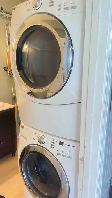 A full bath with shower/tub combo is upstairs and a shower/double sink combo is in the downstairs suite. The full size washer and dryer is located downstairs in the guest suite as well.
