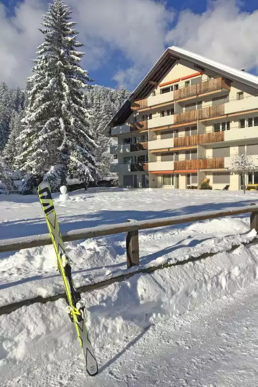 Laax-Murschetg 25 km from Chur: Comfortable apartment house "Val Signina", built in 1974, renovated in 2012, surrounded by trees and meadows. On the outskirts, 2 km from the centre of Laax, in the district Surselva, in a quiet position, in the countryside. For shared use: table tennis. In the house: lift, storage room for skis, central heating system, washing machine, tumble dryer (for shared use, extra). Motor access to the house. Communal covered parking. Parking space or garage only for small to medium-sized cars. Dimension: height 194 cm. E-charging station. Shop 150 m, supermarket 100 m, restaurant 150 m, bar, bus stop "Postauto" 200 m, railway station "Chur" 25 km. Golf course (18 hole) 6 km, walking paths from the house 100 m, cable car 100 m, mountain railway, ski lift 150 m, ski school, sled run 200 m. Nearby attractions: Rheinschlucht, Chur, Parc Ela. Well-known ski regions can easily be reached: Flims - Laax. Well-known lakes can easily be reached: Crestasee, Caumasee. Please note: Additional accommodations can be booked. Property ref. CH7031.105 is situated on the same property. ,One more: the CH7031.105.1 and CH7031.105.2 apartments can be rented together.2-room apartment 50 m2 on 1st floor, south facing position. Bright, comfortable and cosy furnishings: open large living/sleeping room with 1 double fold-away bed (2 x 90 cm, length 200 cm), dining table, satellite TV and flat screen. Exit to the balcony. 1 double bedroom with 1 bed (90 cm, length 200 cm), 1 double bed (2 x 90 cm, length 200 cm). Exit to the balcony. Open kitchen (dishwasher, 4 ceramic glass hob hotplates, fondue Set (cheese)). Bath/WC. Balcony 14 m2. Beautiful view of the mountains and the countryside. Facilities: children's high chair. Internet (WiFi, free). Garage space n 7-6 at the house, height 194 cm. Please note: non-smokers only. No skis and ski boots allowed in the apartment in the winter. 571 687.68.266.151