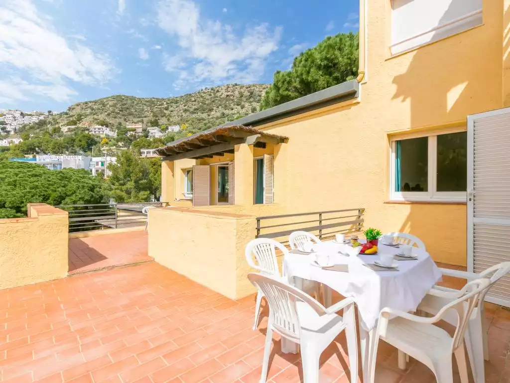 Canyelles Petites: Cosy, simple resort "Velazquez". Canyelles Petites, in the resort 4 km from the centre of Roses, in a quiet, sunny position on a slope, from the sea, 60 m from the beach, road to cross. For shared use: swimming pool angular (10 x 4 m, depth 80 - 180 cm, seasonal availability: 12.May. - 30.Sep.) with internal staircase. In the house: WiFi. Shop 150 m, grocery, supermarket 150 m, restaurant 100 m, bar 20 m, café, pedestrian zone 30 m, bus stop 100 m, sandy beach "Canyelles Petites" 60 m, swimming bay 60 m. Sports harbour 3 km, golf course (18 hole) 24 km, surf school 3 km, sailing school 3 km, tennis 5 km, riding stable 10 km, sports centre 3.5 km. Nearby attractions: Parque Acuático Aquabrava Roses 6 km, Skydive y túnel del viento Empuriabrava 11 km, Cadaqués 18 km, Castillo y casino de Perelada 25 km, Monasterio de Sant Pere de Rodes 24 km, Museo Dalí Figueres 24 km. Please note: the keys‘ handover takes place by the agency Interhome in Roses. Additional accommodations can be booked. The apartments are built on terraced land and set on a hillside. The apartments' terraces are intercommunicated so there is little privacy. Access to the individual apartments and the swimming pool down some steps. The apartments are situated 60 m from the Canyelles Petites beach, one of the most beautiful beaches in the Costa Brava. Please note: The residence requests no noise after 23:00 hrs. Exception: ES9410.383.1, with terrace and private entrance. Available private garage in all apartments except the es9410.383.3 Pease note : apartments without heating.4-room apartment 83 m2. Simple furnishings: living/dining room with TV. Exit to the terrace. 1 room with 2 beds and fan. 1 room with 1 french bed and fan. 1 room with 1 french bed and fan. Kitchen (4 ceramic glass hob hotplates, microwave, freezer, electric coffee machine). Shower/WC. No heating option. Terrace. Terrace furniture. Facilities: washing machine. Internet (WiFi, free). Garage space n 2. Please note: non-smokers only. TV only ES. Apartment has no heating. Garage dimensions from wall to wall: length 5,20 x width 2,41. HUTG007510