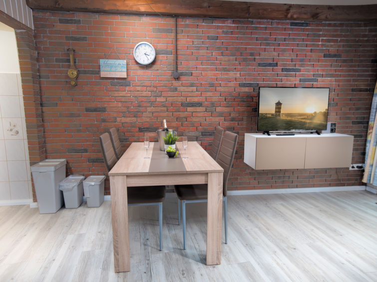 Terraced house "Muschelhaus". In the resort, 800 m from the sea, from the beach, in a cul-de-sac. For shared use: garden with lawn. In the house: central heating system, washing machine (extra), tumble dryer (for shared use, extra). Parking at the house. Supermarket 800 m, restaurant, bakery 800 m, bus stop 450 m, railway station 1.8 km, ferry 2 km, sandy beach 1.1 km, outdoor swimming pool 14 km, indoor swimming pool 850 m. Golf course (18 hole) 8 km, surf school 1 km, tennis 2 km, minigolf 800 m."Venusmuschel", 3-room terraced house 50 m2, on the ground floor. Partly renovated in 2021, cosy furnishings: living/dining room 18 m2 with satellite TV (flat screen). Exit to the terrace. 1 room 8 m2 with 1 double bed (2 x 90 cm, length 200 cm). 1 room 7 m2 with 2 beds. Kitchenette (2 ceramic glass hob hotplates, toaster, kettle, microwave, electric coffee machine). Shower/WC. Terrace 8 m2. Terrace furniture, deck chairs (2). Facilities: children's high chair (extra). Internet (WiFi, free). Please note: non-smoking house. Maximum 1 pet/ dog allowed. Smoke alarm.