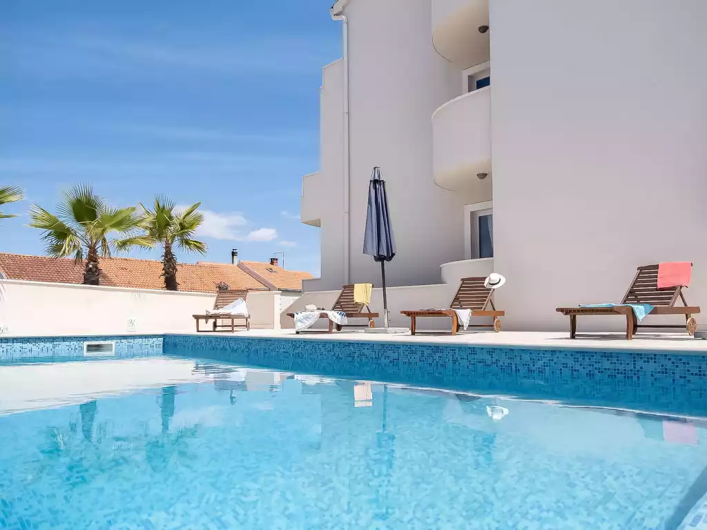 Available for guests: 2 swimming pools. Apartment house "Villa 2 Pools". 400 m from the centre of Sutivan, in a quiet, sunny position, 190 m from the sea, 190 m from the beach. For shared use: swimming pool angular (8 x 4 m, depth 170 cm, seasonal availability: 01.May. - 01.Oct.) with internal staircase. Outdoor shower, terrace (60 m2), garden furniture, barbecue. In the house: internet access, sauna (extra). Fitness room. Parking at the house on the premises. Shop, restaurant 400 m, bus stop 1.8 km, shingle beach 300 m, rocky beach 190 m. For shared use: swimming pool angular (7 x 4 m, depth 140 cm, 01.05.-01.10.) with internal staircase. Use of sauna 300 eur extra to be paid on spot.3-room apartment 45 m2 on 2nd floor, north facing position. Living/dining room with 1 sofabed (130 cm, length 190 cm), satellite TV and air conditioning. Exit to the balcony. 1 room with 1 double bed (2 x 80 cm, length 200 cm), shower/WC. 1 room with 1 double bed (2 x 80 cm, length 200 cm). Open kitchen (oven, dishwasher, 2 ceramic glass hob hotplates, freezer). Shower/WC. Balcony 6 m2. Balcony furniture. Facilities: Internet (WiFi, free).