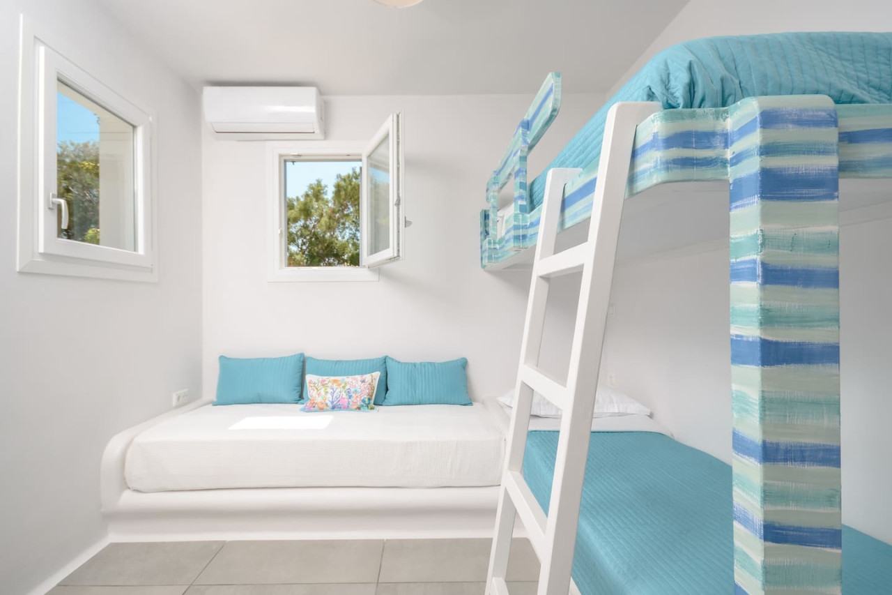 A triple bedroom with bunk beds and a queen-size bed The bathrooms reflect a traditional yet modern Cycladic style, featuring polished cement in earthy tones.