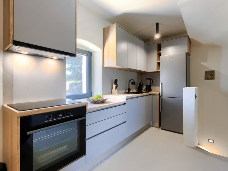 Beautiful terraced house "Villa Luca", 3 storeys, renovated in 2022. In the hamlet Muntrilj 4 km from the centre of Tinjan, in a sunny position, 20 km from the sea. Private: property 200 m2 (fenced), swimming pool angular (22 m2, depth 150 cm, seasonal availability: 01.May. - 01.Oct.) with internal staircase. Outdoor shower, terrace (15 m2), garden furniture, barbecue, pool maintenance by the owner/gardener. In the house: internet access, washing machine. Parking (for 2 cars) at the house on the premises. Shop 4 km, restaurant 4 km, bar 4 km, bus stop 3.5 km, pebble beach 20 km, rocky beach 20 km. Walking paths from the house 100 m, cycle lane 150 m. Nearby attractions: Adrenalin park 8 km. The owner does not accept any youth groups.3-room terraced house 109 m2 on 3 levels. Very beautiful and tasteful furnishings: 1 open room with 1 french bed (160 cm, length 200 cm), shower/WC and air conditioning. Exit to the swimming pool. Upper floor: living/dining room with satellite TV (flat screen), air conditioning. Open kitchen (oven, dishwasher, 4 induction hot plates, toaster, kettle, microwave, freezer, electric coffee machine). Top floor: 1 open room with sloping ceilings, ceiling height 180 - 250 cm with 1 french bed (160 cm, length 200 cm), shower/WC and air conditioning. Heating. Electric barbecue, deck chairs. View of the swimming pool. Facilities: safe, iron, mosquito net, baby cot, hair dryer. Internet (WiFi, free).