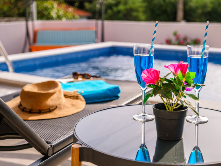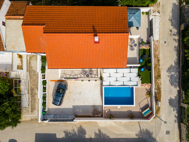Single-family house "Villa Renesansa", 2 storeys. In the resort Milna, in a quiet, sunny position, 200 m from the sea, 500 m from the beach. Private: property 500 m2 (fenced), swimming pool (4 x 6 m, depth 160 cm, seasonal availability: 01.May. - 01.Oct.). Outdoor shower, terrace (37 m2), garden furniture, barbecue, pool maintenance by the owner/gardener. In the house: internet access, washing machine, tumble dryer. Parking (for 2 cars) at the house on the premises. Shop, restaurant 300 m, bus stop 1.3 km, ferry 20 km, rocky beach 500 m. Marina 1 km.5-room villa 220 m2 on 2 levels. Living/dining room with satellite TV (flat screen), air conditioning. Exit to the terrace. 1 room with 1 french bed (160 cm, length 200 cm), shower/WC and satellite TV (flat screen), air conditioning. Open kitchen (oven, dishwasher, 4 ceramic glass hob hotplates, microwave, freezer, electric coffee machine). Sep. WC. Upper floor: 3 rooms, each room with 1 french bed (160 cm, length 200 cm), shower/WC and satellite TV (flat screen), air conditioning. 2 balconies 9 m2, balcony 4 m2, terrace 10 m2, roofed. Terrace furniture, electric barbecue, deck chairs (4). Facilities: washing machine, dryer, safe, baby cot, hair dryer. Internet (WiFi, free).