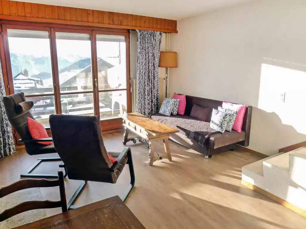 Residence "Villars Soleil", 4 storeys. In the centre of Villars, located by a road, south-east facing position. In the house: lift, central heating system, washing machine (extra), tumble dryer (for shared use, extra). Communal covered parking. Shop, grocery 200 m, restaurant 20 m, bakery 400 m, 1 minute walk to the centre, bus stop, railway station "Villars-Bretaye", indoor swimming pool 1 km, thermal baths "Lavey-les-bains" 19 km. Sports harbour 25 km, golf course (18 hole) 7 km, indoor tennis centre 900 m, sports centre 900 m, mountain railway 400 m, gondola lift 600 m, ski bus stop 140 m, ski school 450 m, children's ski school 500 m, ice rink 1 km, children's playground 600 m. Free ski bus service to the ski region Villars."Villars Soleil A27", 3-room maisonette 70 m2 on 3rd floor, south-east facing position. Practical furnishings: living/dining room with open-hearth fireplace (only for decoration), dining table and TV. Exit to the balcony. 1 room, without wardrobe with 2 beds. 1 room with 2 beds. Open kitchen (3 hot plates, oven, toaster, kettle, electric coffee machine, raclette grill, fondue Set (cheese)). Bath/bidet/WC. Balcony. Terrace furniture. Partial view of the mountains and the countryside. Facilities: hair dryer. Internet (WiFi, free). Garage space n H. Please note: apartment street side. Fridge without freezer. Maximum 1 pet/ dog allowed.
