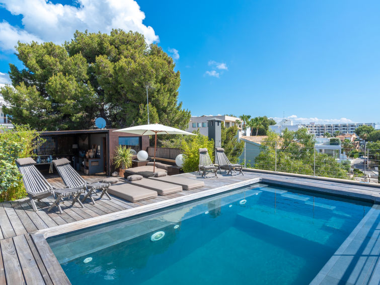Very large, modern villa "Vistamar", 3 storeys, detached. In the district of Sant Agustí - Cala Major, outside the resort, 7 km from the centre of Palma, in a quiet, sunny position, 1.2 km from the sea, 1.2 km from the beach. Private: terraced garden, swimming pool angular, heated (6 x 3 m, depth 50 - 150 cm, seasonal availability: 01.Jan. - 31.Dec.). Outdoor shower, pool house with fridge, arbour, pergola, terrace, garden furniture, pool maintenance by the owner/gardener. In the house: central heating system, air conditioning, burglar alarm system. Roofed, parking (for 2 cars) at the house on the premises. Supermarket, shopping centre 4.6 km, restaurant 1 km, bar 700 m, bicycle rental 1.3 km, pub garden 700 m, 12 minute walk to the centre, bus stop "1332-Noruega Bus Stop" 50 m, railway station "Plaza España, Palma" 7.1 km, ferry "Puerto de Palma" 5 km, sandy beach "Cala Major" 1.1 km, rocky beach 950 m. Sports harbour 1 km, marina 1 km, golf course (18 hole) 2.7 km. Nearby attractions: Centro Palma Ciudad 7 km, Portals Nous 5.1 km, Port Andratx 23.6 km, Playa Es Trenc 51 km, Valldemossa 21 km, Santuario de Lluc 50.6 km. Hiking paths: Serra de Tramuntana, Serra de Na Burguesa 7 km. Please note: car recommended. Object suitable for 8 adults. The owner does not accept any youth groups. Airfield 16.1 km from the property. Neighbourhood highly sensitive to noise. Quietness and good behaviour expected."Vistamar", 5-room villa 320 m2 on 3 levels. Object suitable for 8 adults. Spacious and bright, very comfortable and stylish furnishings: open large living/dining room with panoramic window with open-hearth fireplace (only for decoration), dining table, digital TV, flat screen, air conditioning and forced-air heating. Exit to the terrace. Open kitchen (oven, dishwasher, 3 ceramic glass hob hotplates, toaster, kettle, microwave, freezer, electric coffee machine, cooking island). Sep. WC. On the lower ground floor: 1 double bedroom with panoramic window with 2 beds (90 cm, length 200 cm), shower/WC, air conditioning and forced-air heating. 1 large double bedroom with panoramic window with 1 french bed (150 cm, length 200 cm), digital TV, flat screen, air conditioning and forced-air heating. Exit to the terrace. Shower/WC. Upper floor: 1 large double bedroom with panoramic window with 1 french bed (200 cm, length 200 cm), open-hearth fireplace (only for decoration), shower/bidet/WC, double hand-basin, digital TV, flat screen, air conditioning and forced-air heating. 1 double bedroom with 1 french bed (180 cm, length 200 cm), bath/bidet/WC, digital TV, flat screen, air conditioning and forced-air heating. Exit to the terrace. 2 small terraces, 2 large terraces, porch. Terrace furniture, balcony furniture, electric barbecue, deck chairs, covered balcony. Very beautiful panoramic view of the sea and the bay. Facilities: washing machine, iron, children's high chair, baby cot for up to 2 year olds, hair dryer. Internet (WiFi, free). Parking (roofed, fenced 2 cars). Please note: non-smoking house. Fire extinguisher, no lift. The pool mentioned in the description is for private use. ETV/2553 // Reg. Nr.: ESFCTU00000702600044406700000000000000000000ETV/25531