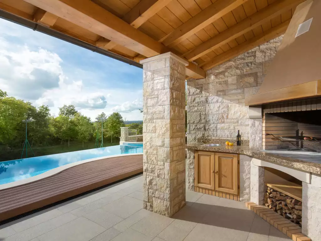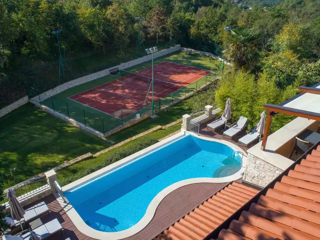 Beautiful villa "Vlastelini", 2 storeys, built in 1921, renovated in 2011. 1 km from the centre of Labin, in a quiet, sunny position on a slope, 3.5 km from the sea, 3.5 km from the beach. Private: property 7'000 m2 (fenced), beautiful garden with lawn and wildlife garden, swimming pool heated (35 m2, depth 140 cm, seasonal availability: 06.Apr. - 12.Oct.) with internal staircase. Unconventional pool shape. Outdoor shower, tennis, floodlit, table tennis, barbecue. In the house: internet access, central heating system, washing machine, tumble dryer. Towel change daily. Roofed, parking (for 4 cars) at the house on the premises. E-charging station. Shop 900 m, restaurant 600 m, bus stop 2.7 km, pebble beach 3.5 km, rocky beach 3.5 km. Walking paths from the house 100 m, cycle lane 150 m. Please note: suitable for families. Groups of teenagers on request only. Animals in the neighbourhood. Traditional tavern in the ground floor with open-hearth fireplace, kitchen (4 induction hot plates, oven, dishwasher, freezer), satellite TV (flatscreen), hi-fi system, DVD player, air conditioning, exit to the pool. Separate WC. Putting green. By groups of young people double deposit is requested on arrival. Swimming pool heated (extra). It is necessary to announce 7 days in advance if the pool heating is required. Welcome pack and champagne upon arrival.5-room villa 265 m2 on 2 levels. Beautiful and tasteful furnishings: living/dining room with open-hearth fireplace (only for decoration), satellite TV (flat screen), hi-fi system, DVD and air conditioning. Exit to the terrace. 1 room with 1 french bed (160 cm, length 190 cm), shower/WC and satellite TV (flat screen), air conditioning. Open kitchen (oven, dishwasher, 4 ceramic glass hob hotplates, microwave, freezer, electric coffee machine). Sep. WC. Upper floor: 1 room with 1 french bed (180 cm, length 200 cm), shower/WC and satellite TV (flat screen), air conditioning. Exit to the terrace. 1 room with 1 french bed (160 cm, length 200 cm), shower/WC and satellite TV (flat screen), air conditioning. Exit to the terrace. 1 room with 1 french bed (160 cm, length 200 cm), shower/WC and satellite TV (flat screen), air conditioning. Terrace 30 m2, roofed, 2 terraces 18 m2, roofed. Terrace furniture, deck chairs. View of the swimming pool, the garden and the countryside. Facilities: safe, baby cot, hair dryer. Internet (WiFi, free). Please note: non-smoking house. 2163-09-09-12-01/4