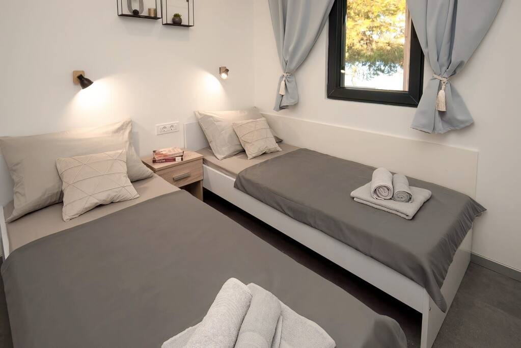 Welcome to our brand-new house in the Vortex Green camp! Our house is located on the first line to the Adriatic Sea, offering an amazing view of the quiet bay. The house is perfect for groups of 4, with 2 bedrooms and 2 bathrooms. It is fully furnished and equipped with everything you need to make your stay comfortable. Built in 2023, our house is modern and stylish, with all the amenities you need to enjoy your vacation.