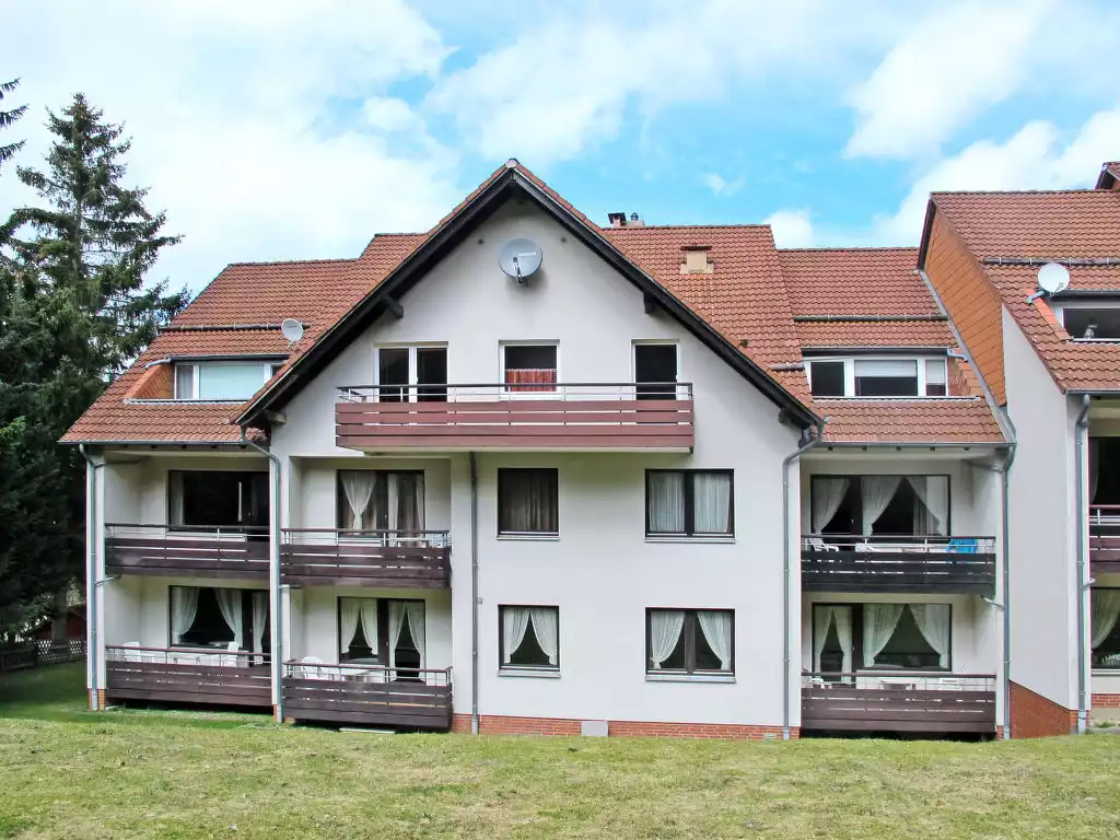 Apartment block "Seeblick". In the district of Bockswiese 1 km from the centre of Hahnenklee, 12 km from the centre of Goslar, 15 km from the centre of Altenau, on a slope, along the wooded area, 2 km from the lake. For shared use: property 3'000 m2 with lawn and trees, pond. Stepped path (5 steps) to the house. Parking (for 2 cars) on the premises. Supermarket 1 km, restaurant 300 m, bus stop 1 km, railway station "Goslar" 16 km, indoor swimming pool 1 km, bathing lake "Kuttelbacher Teich" 2 km. Walking paths from the house 10 m."Waldoase", 2-room apartment 68 m2 on 2nd floor. Partly with sloping ceilings, cosy furnishings: living/sleeping room with 1 double sofabed, dining table and satellite TV (flat screen), hi-fi system and DVD. Exit to the balcony. 1 room with 1 double bed. Exit to the balcony. Open kitchen (4 hot plates, oven, toaster, kettle, microwave, freezer, electric coffee machine). Shower/WC. Gas heating. Carpet. Balcony 8 m2, south facing position. Balcony furniture, deck chairs (2). Facilities: safe, children's high chair, baby cot. Internet (WiFi, free). Please note: non-smokers only. Smoke alarm, fire extinguisher. Storage room in the basement.