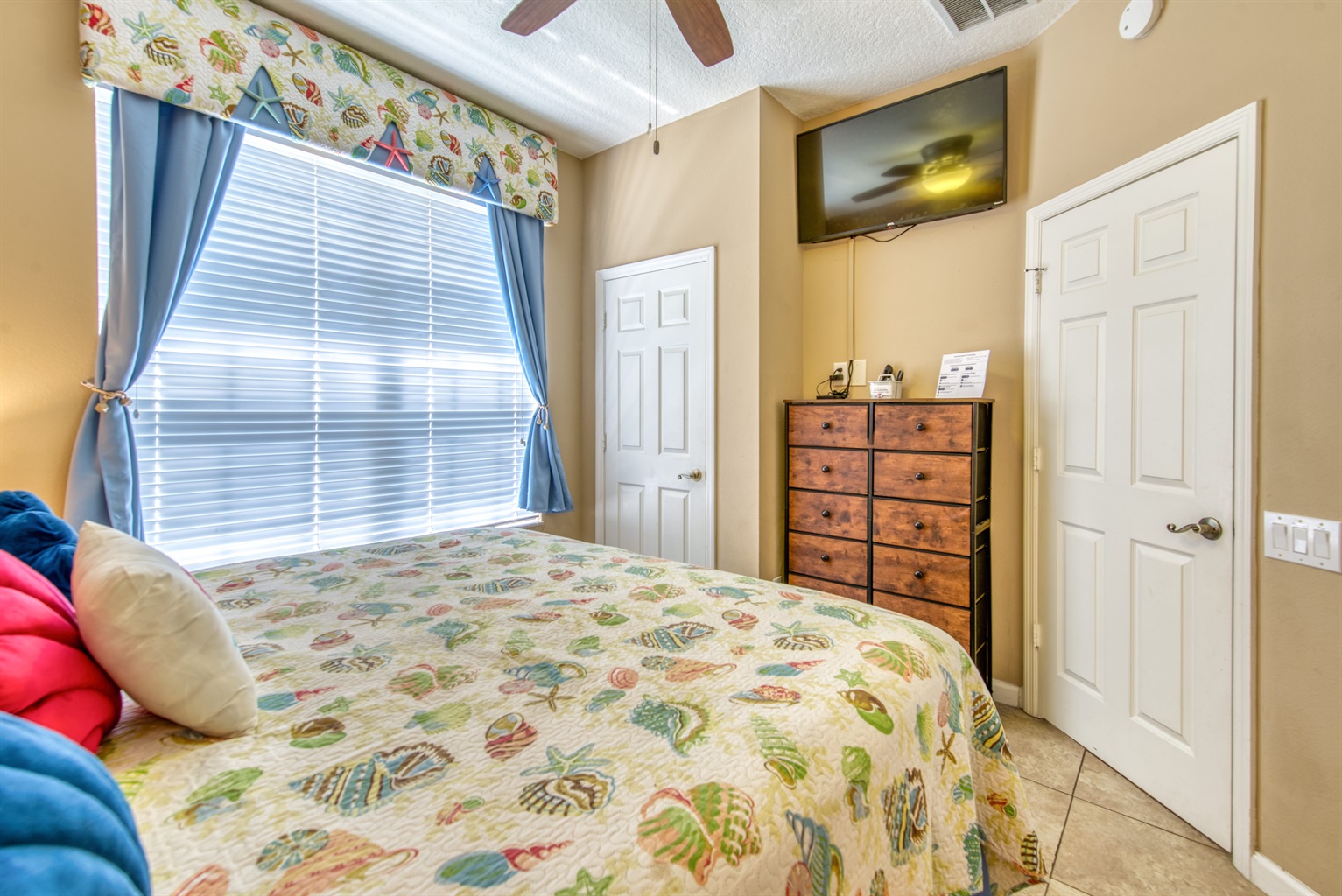 This townhouse can comfortably accommodate a party of 9. There are two bedrooms upstairs, and one bedroom on the ground floor. The ground floor has a spacious, open layout with a full kitchen and living area. Stepping outside the back door leads into the private, screened-in patio and pool area. The front door is secured by an electronic deadbolt lock, for which a unique access code is provided to each guest. Once inside the front gate of the resort, it's a stress-free, self-check-in process.