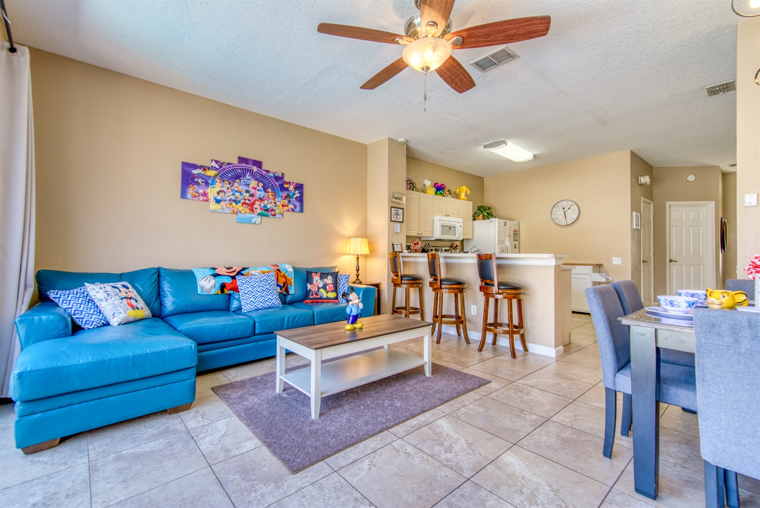 Stepping into the living room, you're met with a dining table ideal for enjoying a quick bite to eat before heading to the parks. After the day is over, enjoy relaxing on one of the two comfortable couches while being entertained by the enormous 75" smart TV mounted on the wall, which is easily viewable even from the kitchen.