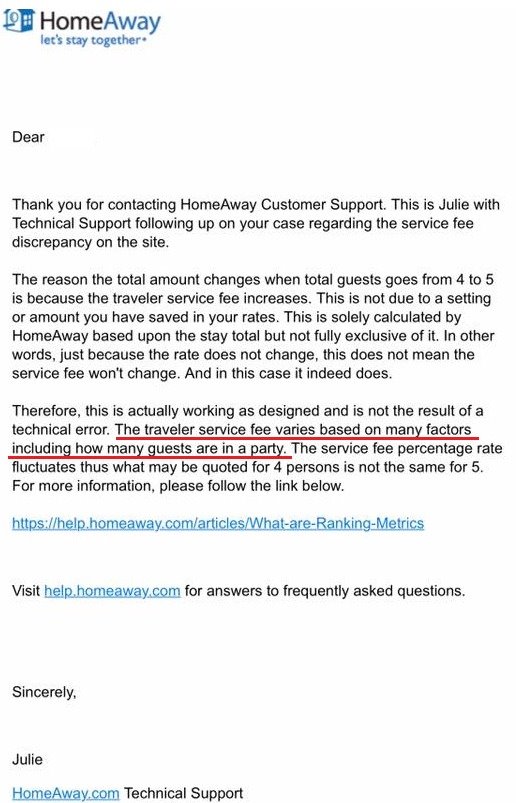 It didn't stop there- HomeAway/VRBO and the rest of the Expedia Group of OTAs (Online Travel Agencies) found another way to get more money from our guests. The more people in your group, the more they will charge. Don't believe it? Below is a copy of a letter they sent to an owner asking why the service fee increased based on the number of guests, even though her rate stayed the same..