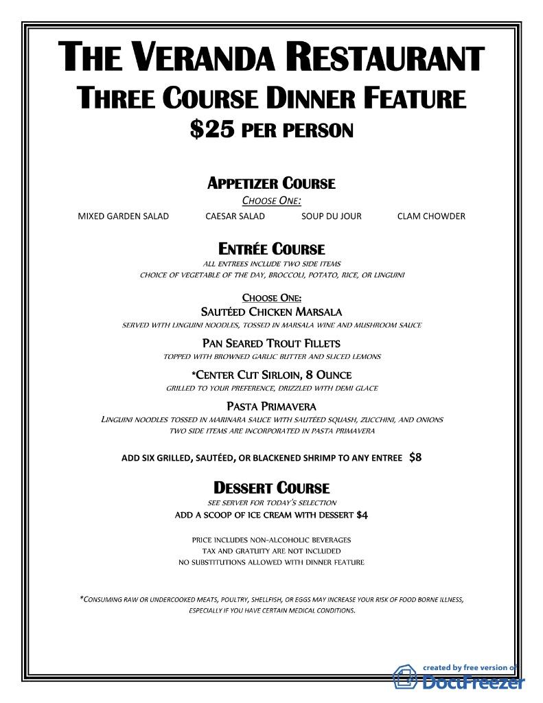Four nights a week, the public may also have dinner at the Veranda. There is a regular menu, or you can opt for the $25 per person 3 course menu: appetizer, entree, dessert, and non-alcoholic beverage included.