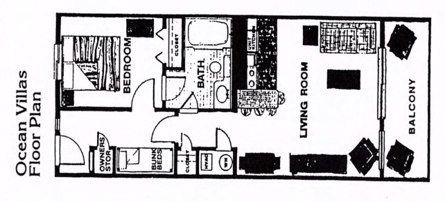 OCEAN VILLAS - 1 BR/1 BA villas (540 sq ft). There are 3 Ocean Villa buildings with 150-168 villas per 3-story building. Most Ocean Villas have a Queen bed in the bedroom (a few may have a Full-size bed). Some have a sleeper sofa in the living room and many have built-in bunks in the hallway (suitable for children 12 and under). Each Ocean Villa has a small kitchen with a full size refrigerator. An elevator and laundry room (using pre-paid laundry cards) are located in each Ocean Villa building.