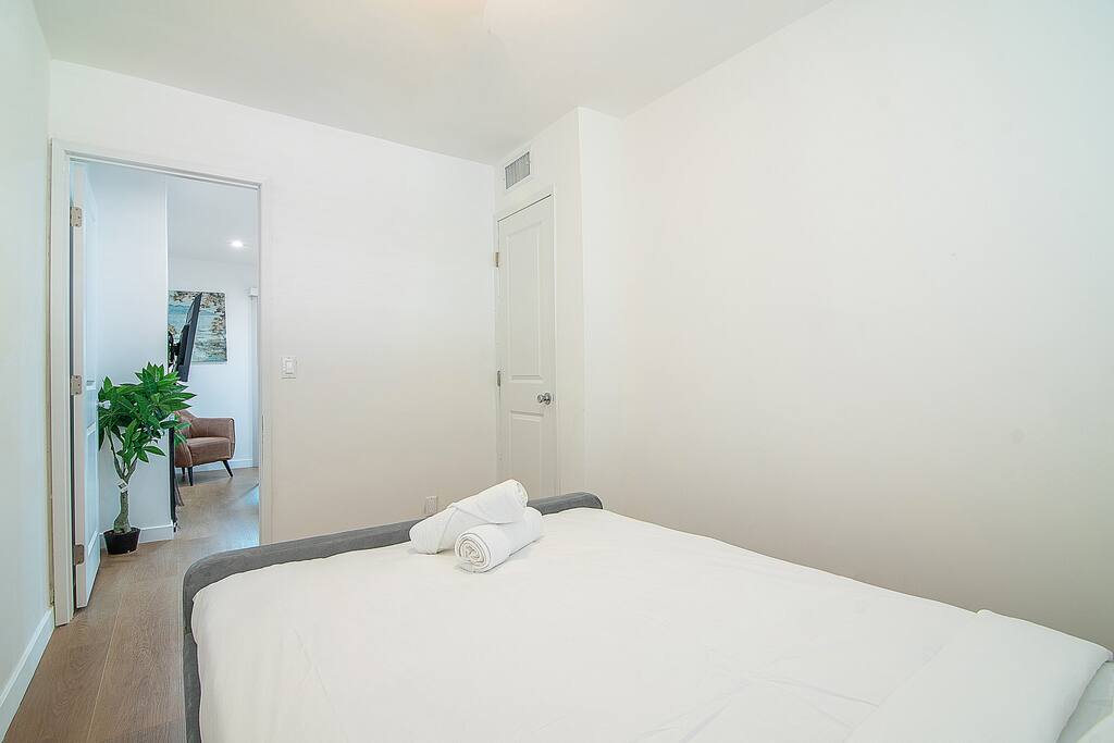 Both main bedrooms have queen beds, and the bonus room features a full-size bed, making it a great space for an extra guest. Central air conditioning and heating keep the apartment comfortable year-round. Guests have access to a refreshing communal pool, ideal for sunny days, and a coin-operated laundry room in the building.