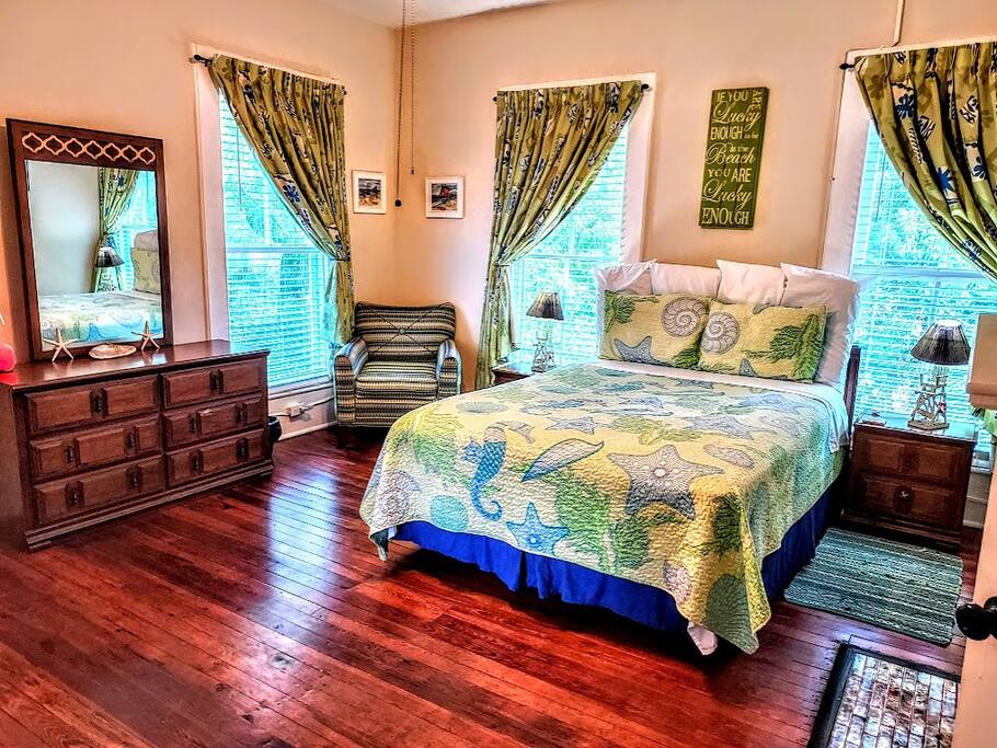 The living, dining, kitchen & utility rooms are all in 1 room, but it works! Im located in Historic Brunswick Ga near our downtown area, but also between both islands & their beaches. Close to every thing you may want to do in the Golden Isles of Ga! The neighborhood has lots of Colonial homes, historic parks with fountains, streets with huge moss covered oaks. I also have another one-bedroom separate apt in this same home downstairs which will sleep 4 so if you wanted a family get-together type situation or you re coming here for a wedding with a lot of family and friends you might want to book both of them at the same time! Look at the bottom of this listing and you will see the other listings. Close to Jekyll Island (about 25 minutes), St Simons Island (about 15 minutes) & Historic Downtown Brunswick (about 3 minutes, 6-8 blocks) where there's restaurants, nightlife, Historic sights, shopping, festivals, farmers market & more. The "Yellow Deli" is about 2 blocks away where you can walk & have breakfast or lunch, & they make their own breads! FLETC & hospital is about 10 minutes away, & Airports nearby! Easy access to I 95 North & South, so about 1 hour to Savannah & Jacksonville. Its a perfect place to stay while on vacation, if you have long or short term business, are looking for a home to buy or a long term rental, traveling nurses, snowbirds or you or a loved one is @ FLETC going to training ect. Its much better than a hotel, & a lot cheaper! The apt has a mostly equipped kitchen with a full size stove & oven, microwave, air fryer toaster oven, drip coffee pot, dishes, silverware, plastic storage ect. All towels & linen for the queen beds, kitchen & bath are provided as well as toilet paper, paper towels, soaps, coffee, filter, sugars & condiments ect. The bath has a full tub w/shower. Stays over 89 nights pay NO TAX!