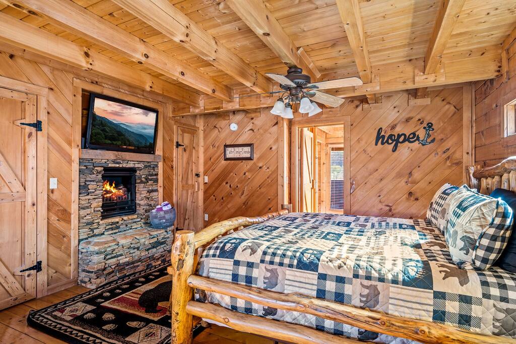 • Second King Bedroom (Upstairs) – Fireplace & forest views
