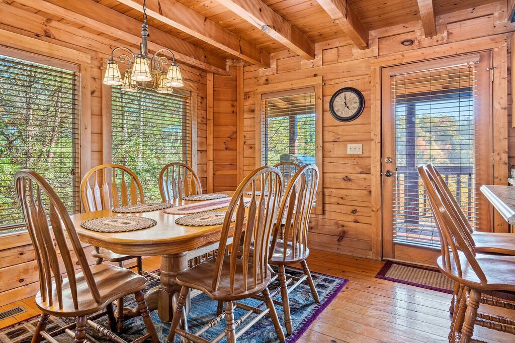 The kitchen is fully stocked with everything you need to whip up your favorite meals—from coffee in the morning to dinner with the whole crew. Enjoy meals together at the 6-person wooden dining table, surrounded by panoramic windows that frame the surrounding Smoky Mountain trees. Cooking in never felt this cozy!