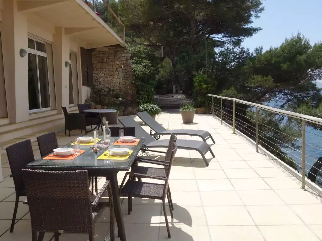 La Madrague 2 km from Saint Cyr Sur Mer: Beautiful 2-family house "Campagne la Source", surrounded by trees. In the resort, 350 m from the sea. Private: terrace (50 m2), garden furniture. In the house: sun terrace. Parking (for 2 cars). Grocery 300 m, restaurant 350 m, bus stop "Le Viguier" 2.2 km, railway station "Saint Cyr les Lecques-La Cadière" 3.2 km, sandy beach 350 m, swimming bay 50 m. Sports harbour 350 m, golf course (18 hole) 4 km. Nearby attractions: Aqualand 3 km, Sentier du Littoral 1 km. Hiking paths: Sainte Baume, Sainte Victoire, Calanques Port-Cros, Porquerolles, Ile verte, Embiez, Figuerolles, Cassis. Please note: the owner lives in the same residence. The grocers shops is situated 300 m away and is opened from 1st May to 30th September.3-room apartment 70 m2. Comfortable and beautiful furnishings: living/dining room with TV (flat screen), DVD and air conditioning. Exit to the terrace. 1 room with 1 french bed (140 cm, length 200 cm), air conditioning. Exit to the terrace. 1 room, window onto the living room with 1 french bed (160 cm, length 200 cm), shower/WC. Open kitchen (dishwasher, 2 ceramic glass hob hotplates, freezer, electric coffee machine, Capsules for coffee machine (Nespresso) extra, combination microwave). Shower/WC. Underfloor heating. Terrace 50 m2, north-west facing position. Terrace furniture, deck chairs. Very beautiful panoramic view of the sea. Facilities: washing machine, dryer, iron, baby cot for up to 2 year olds. Internet (WiFi, free). Please note: non-smokers only. TV only FR. Smoke alarm. Access to the house is via 20 steps down. Access to the cove for swimming is private and is also via steps. 25 m² terrace above the boat garage. Charcoal and wood barbecue prohibited. Pets prohibited. The air conditioning is done by cooling the ground. 83112000214DW