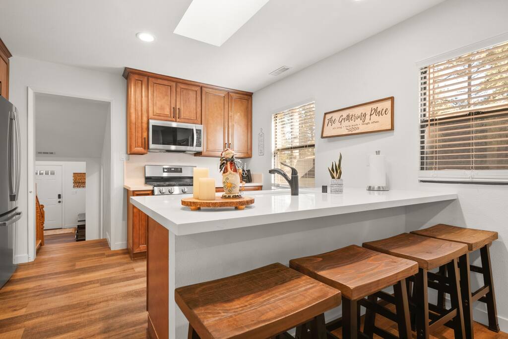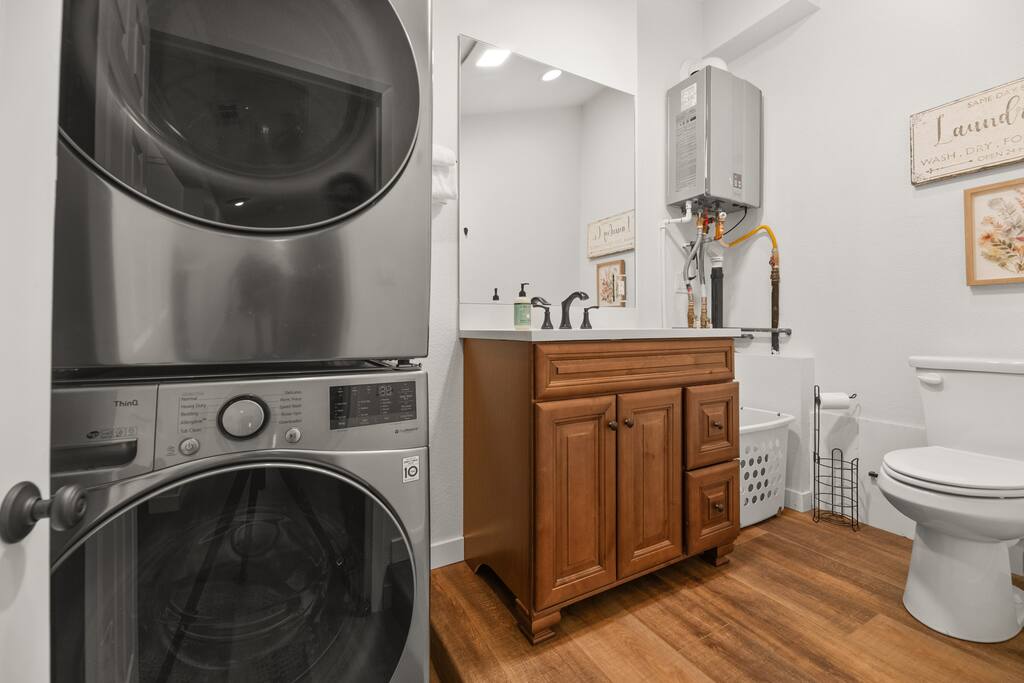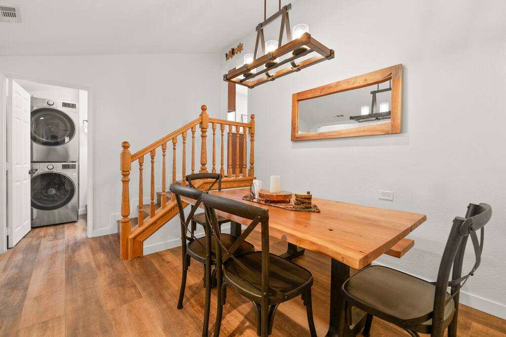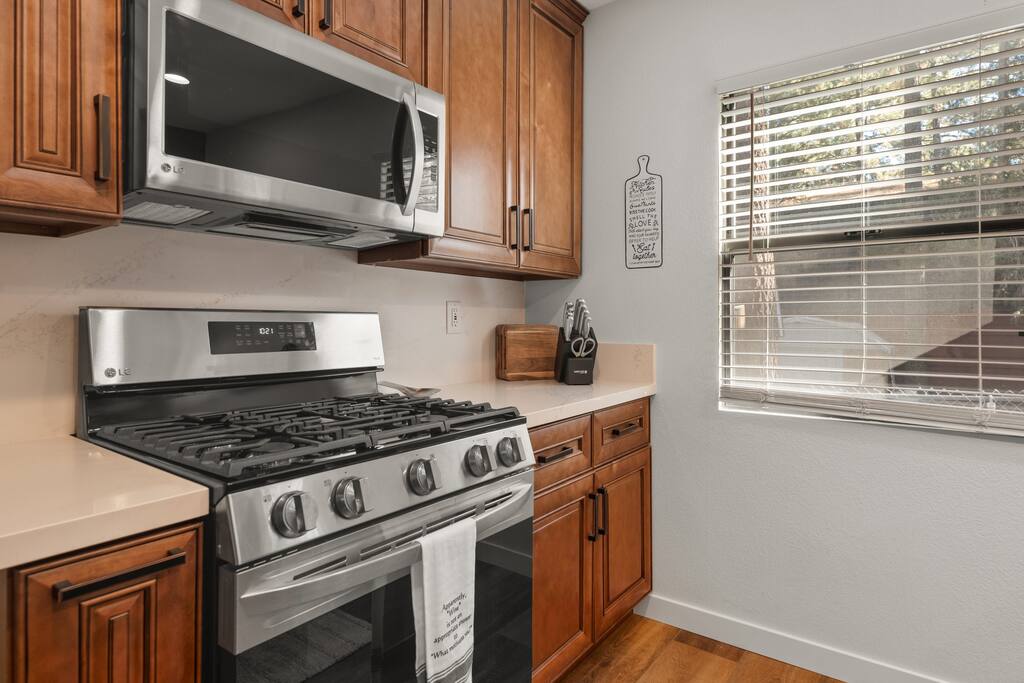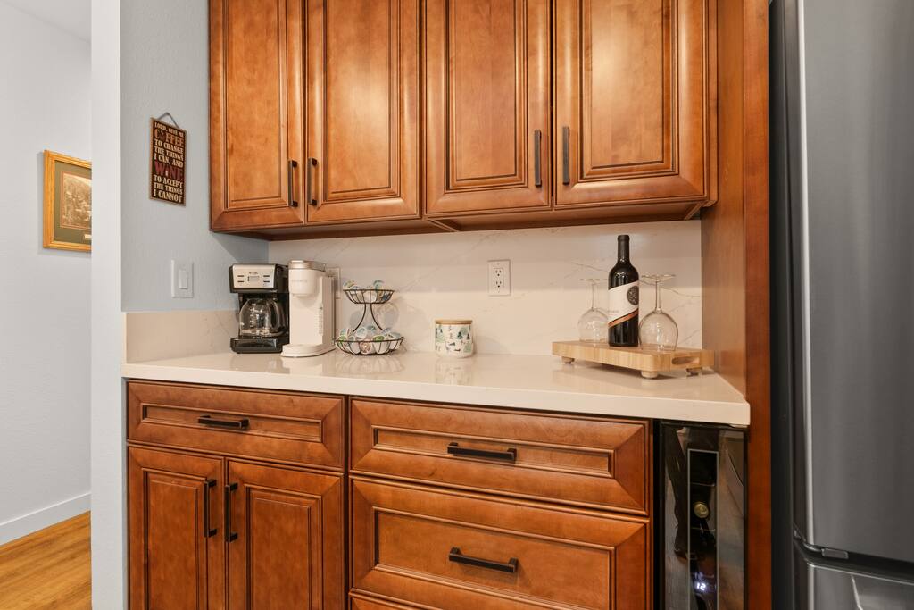 A fully equipped kitchen providing all the amenities of home! Stainless steel appliances, a wine fridge, cooking pots and utensils, toaster, crock pot, microwave, blender, a tea kettle and more.