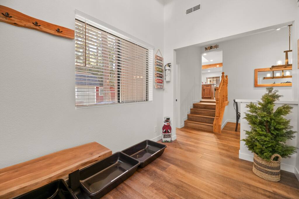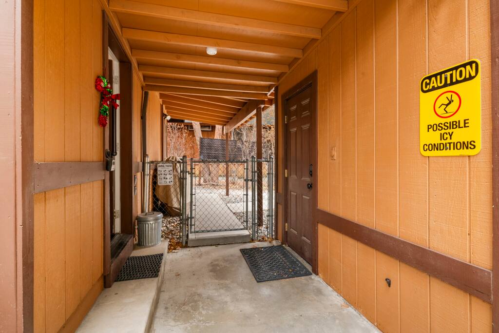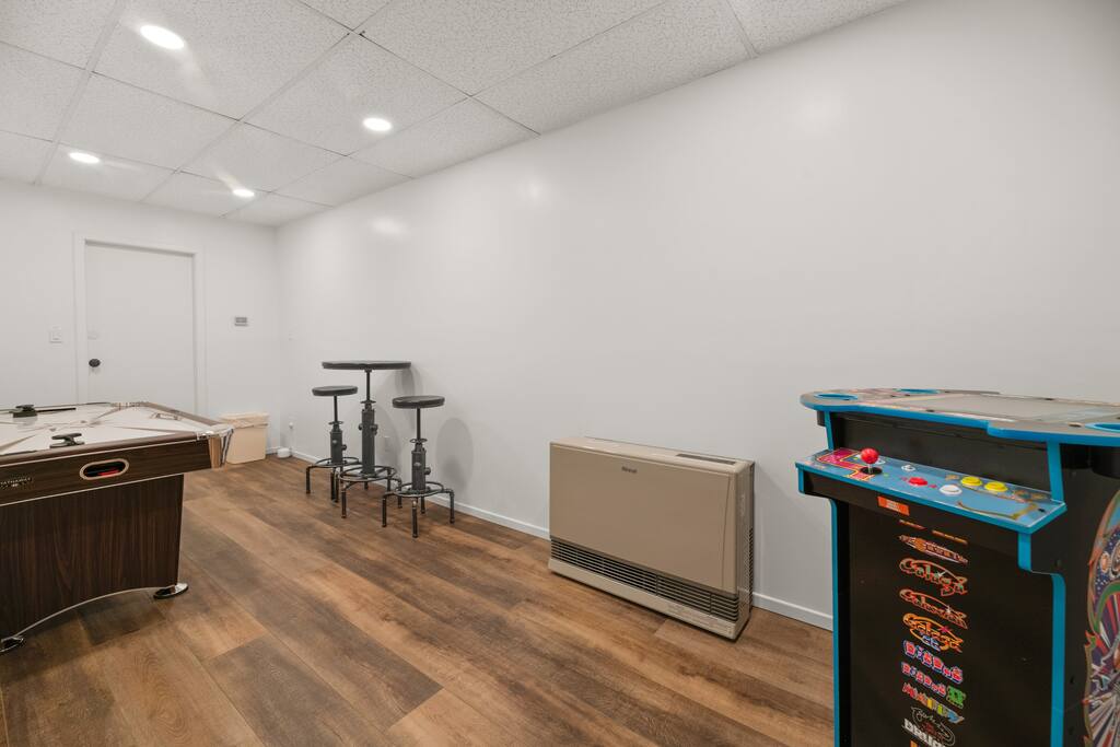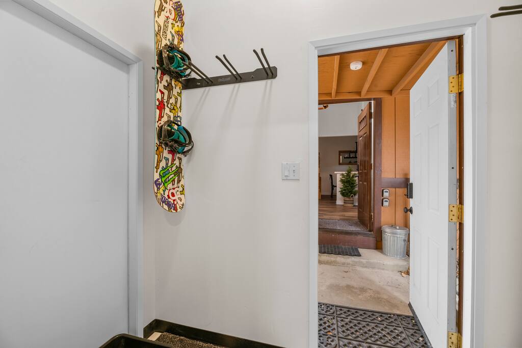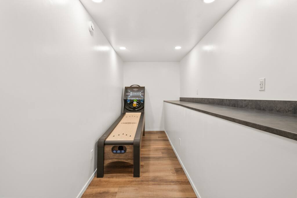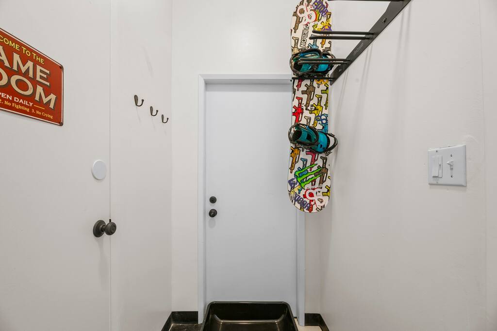 Exiting the back of the house and head right over to the mudroom and gameroom area in the garage building. You can leave your wet snowboards & skis, boots and wet gear hanging in the mudroom. The game room is a spacious place to hang out and play Air Hockey, Ms. Pac-man or a game of skee ball. It is also a great place to work on a puzzle or play a board game.