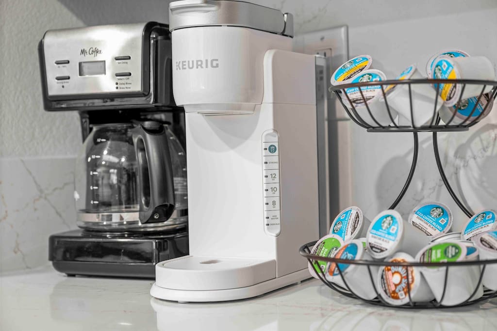 Our coffee station includes a Keurig, and a standard coffee pot.
