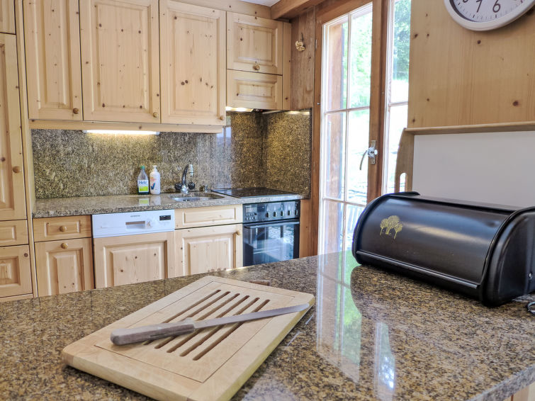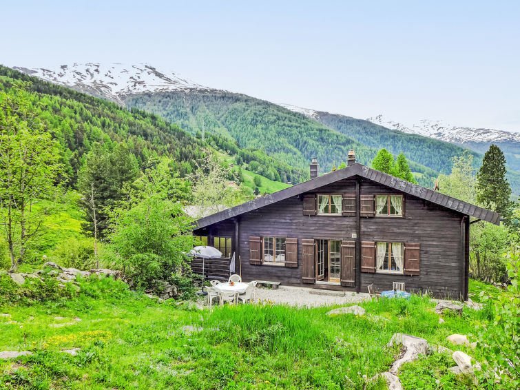 Child friendly, cosy, comfortable chalet "Chalet Kibou", 1'660 m a.s.l., 3 storeys. 2 apartments in the property. On the outskirts, in a quiet, sunny, elevated position on a slope, 20 m from the edge of the forest, 20 m from the stream. Private: natural state property, natural garden, lawn for sunbathing. Terrace, garden furniture. In the house: central heating system. Motor access to 300 m from the house. 180 m steep footpath to the house. Parking (for 2 cars). Grocery 3.5 km, bus stop 300 m, railway station "Visp" 10 km. Chair lift 1 km, slopes 500 m, ski rental 2 km, ski school 2 km, children's ski school 2 km. Well-known ski regions can easily be reached: Bürchen- Moosalp. Please note: baby equipment on request. Groups of teenagers on request only. In case of good snow conditions, the house is accessible on skis.7-room apartment 200 m2 on 2 levels, on the upper floor. Rustic and cosy furnishings: open living/dining room with winter garden with open-hearth fireplace and satellite TV. Exit to the balcony. 2 rooms, each room with 2 beds (90 cm, length 200 cm). Open kitchen (dishwasher, 4 ceramic glass hob hotplates, toaster, kettle, electric coffee machine, raclette grill, fondue Set (cheese)) with dining table. Sep. WC. Top floor: 2 rooms, each room with 2 beds (90 cm, length 200 cm). 2 rooms, each room with 1 bed (90 cm, length 200 cm). Shower/WC. Large balcony, patio. Terrace furniture, deck chairs, conservatory. Marvellous panoramic view of the mountains and the valley. Facilities: children's high chair, baby cot for up to 2 year olds (extra), logs (free). Internet (WiFi). Parking (2 cars). Please note: non-smokers only. Smoke alarm, fire extinguisher.
