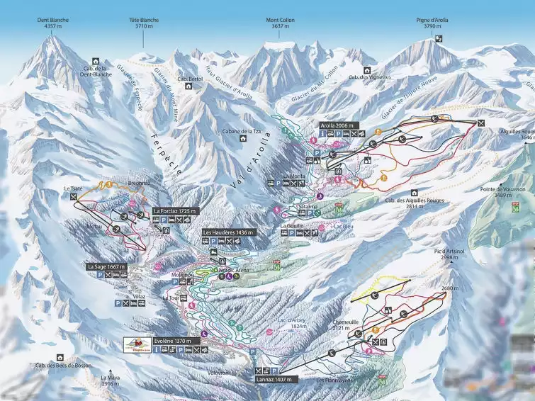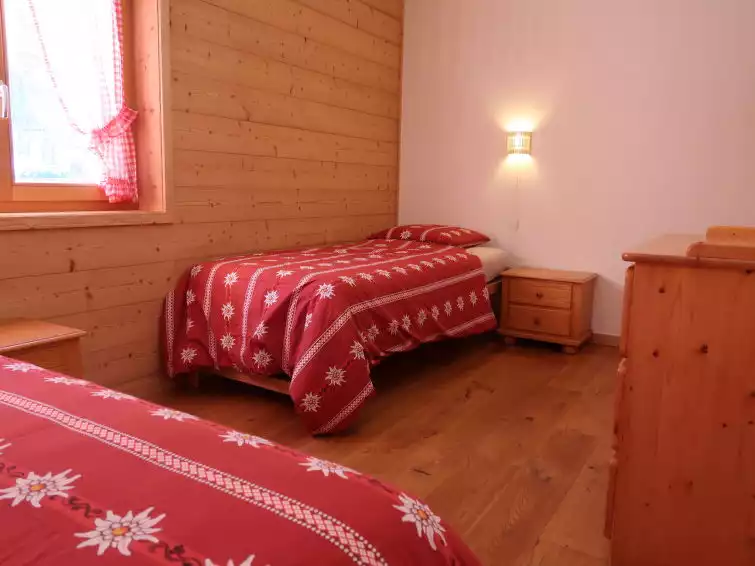 Les Haudères 10 km from Arolla: Cosy, very comfortable chalet "Chalet Molignon", 1'450 m a.s.l.. In the resort, in a quiet, sunny position, south facing position. In the house: lounge with TV, WiFi, storage room for skis, central heating system. Parking. Grocery 550 m, restaurant 600 m, bakery 600 m, bus stop 100 m, thermal baths "Les Grands bains d'Hérémence" 22 km. Tennis 1 km, walking paths from the house 1 m, ski lift 10 km, slopes 3 km, ski rental 550 m, sled run 1 km, cross country ski track 30 m, ice rink 1 km. Nearby attractions: Les Grands Bains d'Hérémence 22 km, Pyramide d'Euseigne 14 km, Centier des Marmottes à Arolla 10 km, Barrage de la Grand Dixence 30 km, VTT Grand Raide, Patrouille de Glacier. Well-known ski regions can easily be reached: Dent Blanche Arolla 15 km. Well-known lakes can easily be reached: Lac d'Arbey 10 km. Hiking paths: Evolène 4 km."Chalet Molignon", 3-room apartment 70 m2, on the ground floor, south facing position. Object suitable for 2 adults + 2 children. Comfortable and tasteful furnishings: living/dining room with Scandinavian wood stove, TV and DVD. Exit to the terrace. 1 room with 1 double bed (2 x 90 cm, length 200 cm). 1 room with 2 beds (90 cm, length 200 cm). Kitchen (oven, dishwasher, 4 induction hot plates, toaster, kettle, microwave, freezer, electric coffee machine, Capsules for coffee machine (Nespresso) extra, raclette grill, fondue Set (chinoise, cheese)). Shower/WC. Terrace 20 m2, south facing position. Terrace furniture, barbecue (portable), deck chairs (4). Very beautiful view of the mountains, the valley and the countryside. Facilities: washing machine, dryer, children's high chair, hair dryer, baby changing unit. Internet (WiFi, free). Parking (2 cars) at the house. Please note: non-smokers only.