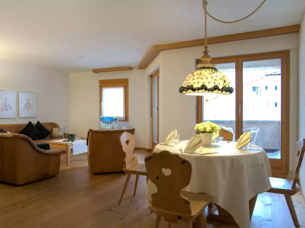 Sils: Beautiful, cosy apartment house "Chesa Ginellas", 3 storeys. On the outskirts, in the residential district, 900 m from the skiing area. In the house: storage room for skis, central heating system, washing machine, tumble dryer (for shared use, extra). Communal covered parking. Grocery 100 m, restaurant 500 m, café, bus stop "Seglias" 300 m, indoor swimming pool 1 km, 1.5 km. Golf course (18 hole) 17 km, surf school 7 km, tennis 1.2 km, minigolf 1.2 km, riding stable 9 km, cycle lane 300 m, ski lift, slopes 900 m, ski rental, ski bus stop, ski school, children's ski school 800 m, sled run 1.2 km, cross country ski track 100 m, ice rink 700 m, children's playground 700 m. Nearby attractions: Nietsche Haus 700 m, Robbi Museum 1 km. Well-known ski regions can easily be reached: Corvatsch-Furtschellas 900 m. Well-known lakes can easily be reached: Silser See 1.5 km, Silvaplana See 1.5 km. Hiking paths: Val Fex & Furtschellas, Via Engadina. Object suitable for 2 adults + 2 children."Chesa Ginellas", 3-room apartment 74 m2 on 1st floor. Bright, partly renovated in 2020, comfortable and cosy furnishings: open living/dining room with dining table and TV (flat screen). Exit to the balcony. 1 double bedroom with 1 double bed (2 x 90 cm, length 200 cm). 1 room with 2 beds (90 cm, length 200 cm). Open kitchen (oven, dishwasher, 4 ceramic glass hob hotplates, toaster, kettle, freezer, electric coffee machine, Capsules for coffee machine (Nespresso) extra, raclette grill, fondue Set (cheese)) with hatch. Bath/WC, sep. WC. Heating. Parquet floors. Balcony furniture. Beautiful view of the mountains. Facilities: iron, hair dryer. Internet (WiFi, free). Garage space n 523 (1 car) at 200 m, height 225 cm, width 210 cm. Please note: suitable for families. Non-smokers only, non-smoking house.