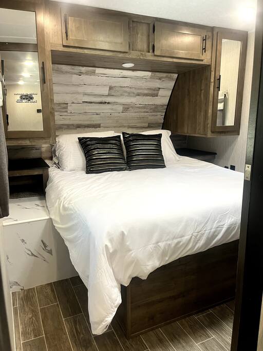 The queen-sized bed has its own storage for clothes both with cabinets as well as small closets on both sides of the bed. The queen bedroom has its own sliding door for privacy and even its own tv!