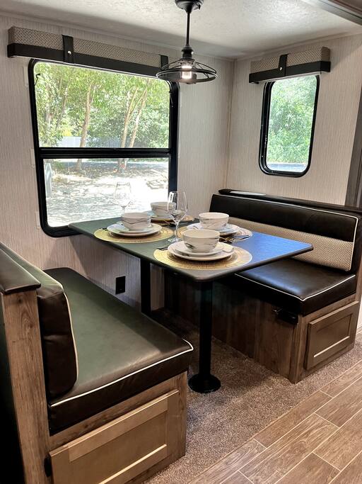 The dinette doubles as a twin-sized bed for one camper with its own set of sheets and bedding.